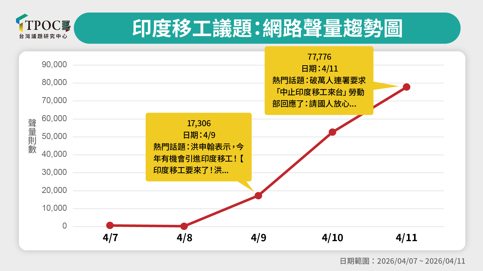 根據TPOC台灣議題研究中心透過QuickseeK快析輿情資料庫調查,自洪申翰在4月9日在立法院答詢時透露,今年將有機會引進印度移工,隨即使「印度移工」的議題聲量大爆發,一口氣衝破單日1.7萬則,且這波討論度持續遞延,4月10日再衝高至單日逾5.2萬則,4月11日進一步勁揚至單日逾7.7萬則,絲毫沒有隨著勞動部「滅火」而「退燒」的跡象。值得注意的是,有民眾早在4月3日就發起呼籲中止引進印度勞工計畫的連署,隨著這幾天新聞媒體紛紛跟進報導,連署人數也不斷增加,並有大量民眾湧入平台留言,表達反對的立場,顯示這已經成為一個「極短期、高強度爆發」的社會爭議事件。