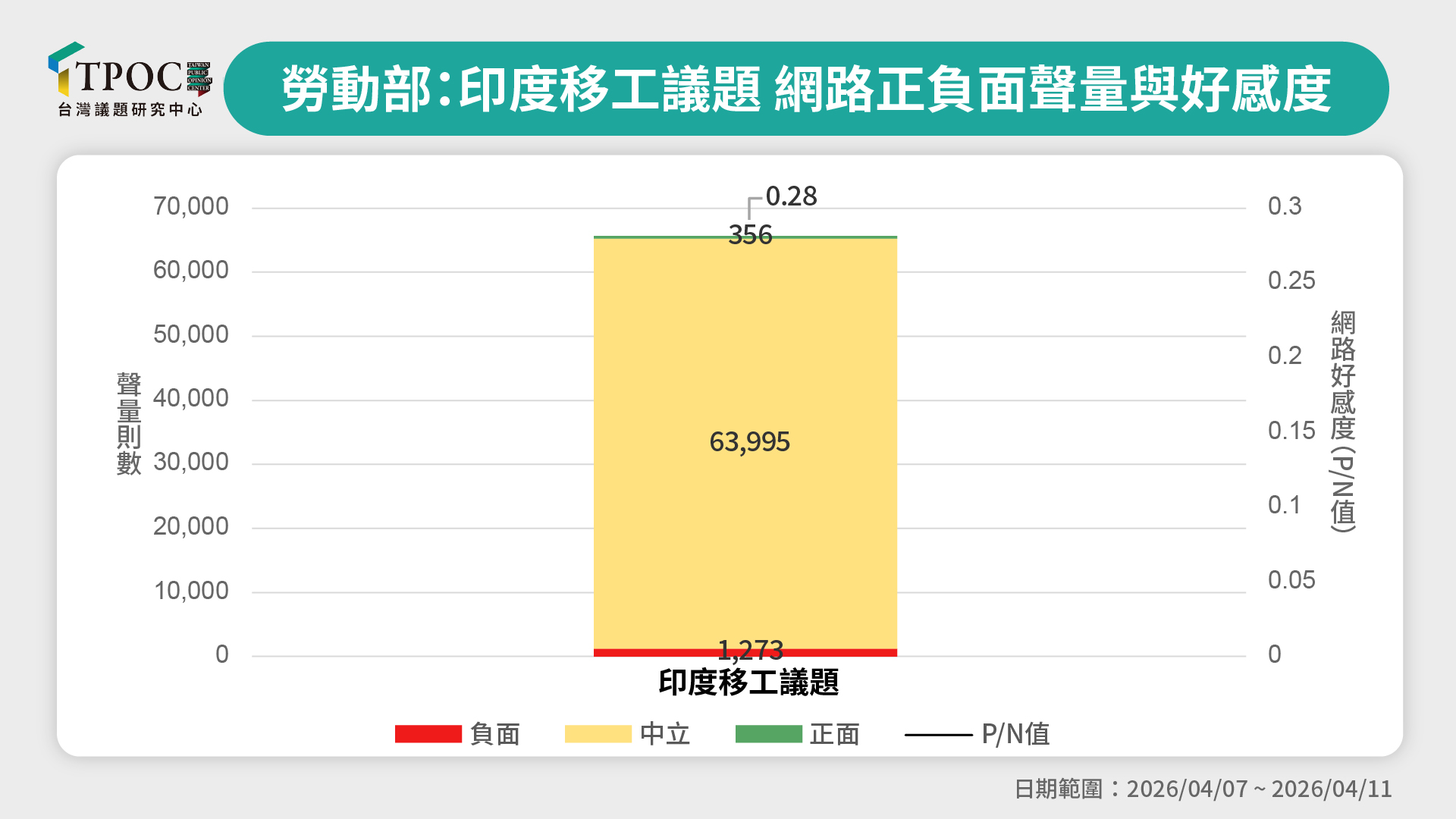 透過網路正負面聲量調查發現,作為主管機關的勞動部,在這個議題上完全處於被動局面,負面聲量遠高於正面聲量,好感度只有0.28。不少熱門負面話題,來自網友們對勞動部的質疑,例如批評未解決失聯移工(網友指稱為逃逸外勞)問題就要引進印度移工、呼籲應優先保障台灣勞工權益等語,凸顯了目前政府的澄清並未能緩解民眾的焦慮感,反而招致更多「管理失靈」的批評。