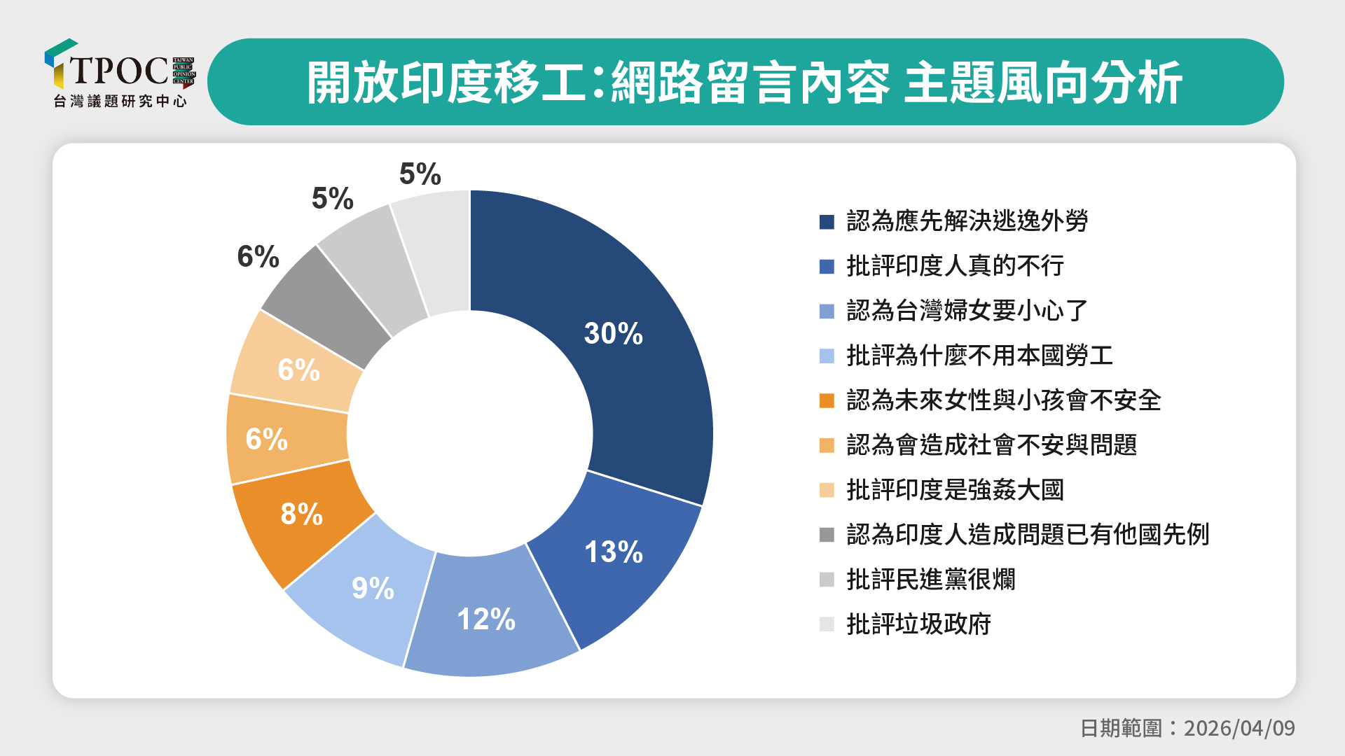 此外,網路留言內容主題風向分析結果顯示,在4月9日爭議爆發首日,網友們的批評聲浪相當大,其中聲量占比最高的留言方向是,呼籲政府應優先解決失聯移工問題,占比高達3成,顯示民眾反對引進移工的主因並非單純排外,而是長期累積了對管理不彰的不滿。另有高達25.5%留言涉及「性別安全」及「印度刻板印象」相關議題,包括批評印度是「強姦大國」,或認為未來台灣婦女、小孩可能變得不安全等。同時,還有超過1成聲量直接轉化為對執政黨的政治攻擊,不可不慎。