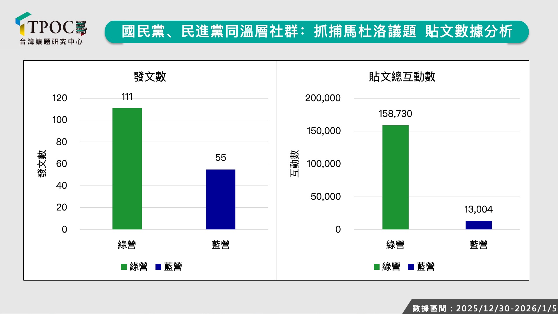 透過分析國民黨、民進黨同溫層社群數據也發現,藍綠社群都熱烈討論此話題,但在網友的貼文互動數上有著顯著差距:綠營總互動數高達15.8萬餘次,壓倒性地「碾壓」藍營的1.3萬次,雙方差了12倍以上。值得注意的是,藍綠社群關注的焦點、討論的話題可說是處於「平行時空」,完全沒有交集,例如綠營社群內高達3成論點來自嘲諷台灣親中勢力、諷刺「疑美論」破產,譏笑藍白陣營過去聲稱美國「不敢動武」的說法已被打臉,另有25%的貼文聚焦貶低中國軍事科技及防禦實力;另一方面,藍營社群有高達35%貼文論述主打「疑美論」,認為美國破壞國際法與主權原則是「教中國怎麼打台灣」,也有30%言論認為川普為了「搶石油」才出手。
