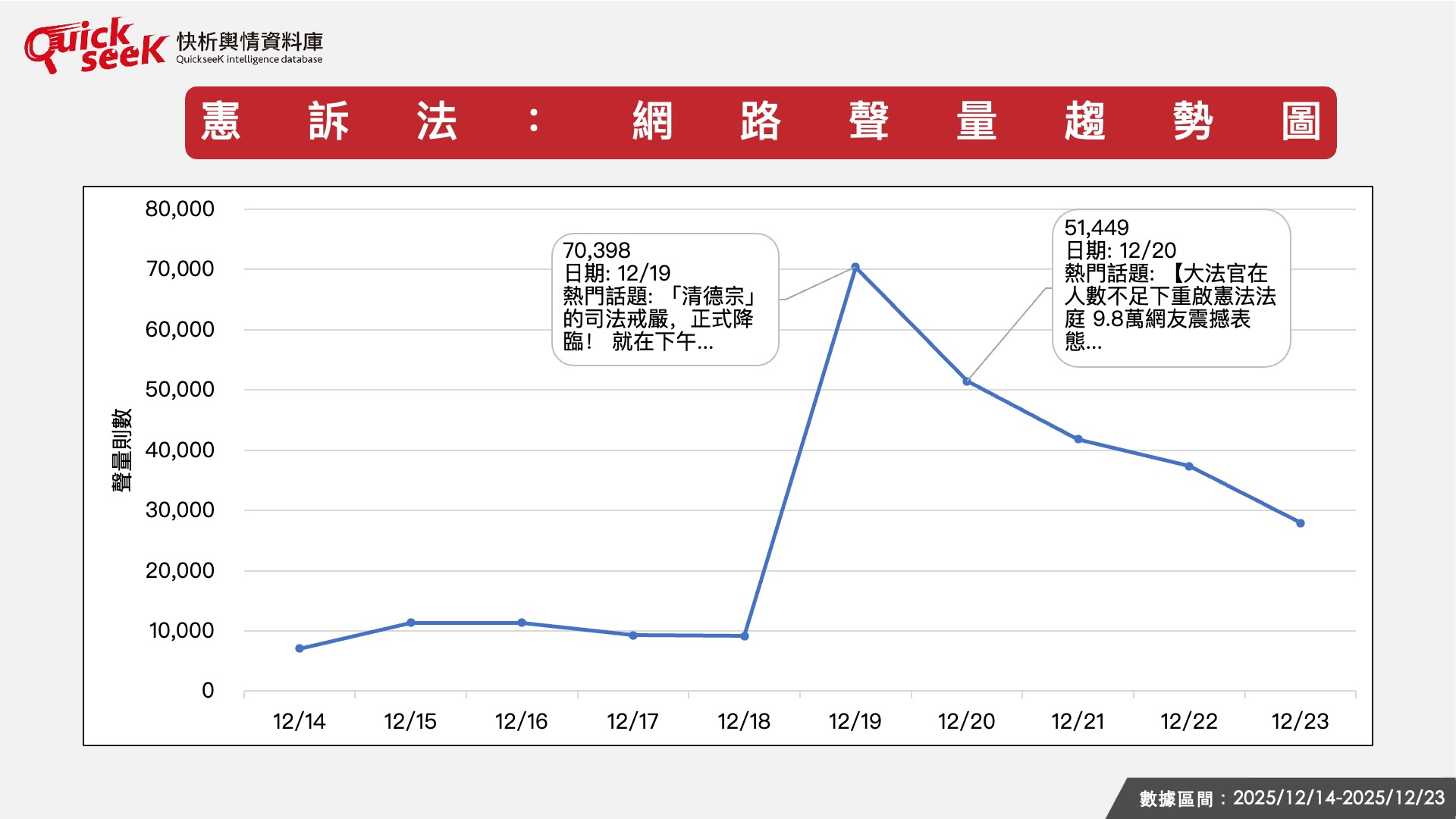 透過QuickseeK快析輿情資料庫觀察憲訴法議題的網路聲量趨勢,在114年憲判字第1號判決出爐前,就因為行政院宣布不副署,連帶引起不少憲法法庭無法運作、憲訴法修法的相關討論,連日來都有數千甚至上萬則,到19日憲法法庭判決出爐,當天聲量一舉衝上7萬398則,此後連續5天聲量都超過2萬則,討論熱烈。其中,熱門話題包括藍委邱鎮軍指控賴清德搞司法戒嚴,將憲法法庭「家法化」,利用憲法法庭完成沒坦克和軍隊的司法政變;還有媒體報導憲法法庭重啟,網友感到震撼,報導稱,在網路上某個YT頻道的民調有96%網友認為「大法官自己不守法,很丟臉」,也成為熱門話題。