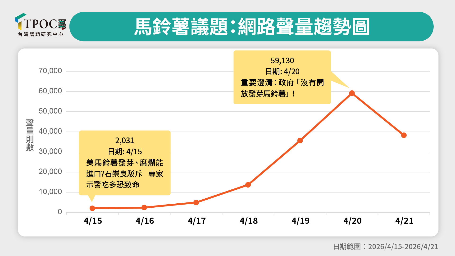 TPOC 台灣議題研究中心透過QuickseeK快析輿情資料庫觀測近期「馬鈴薯之亂」的網路聲量趨勢發現,議題剛浮現的4 月15日,當天熱門話題為衛福部長石崇良便第一時間針對「美馬鈴薯發芽能否進口」進行駁斥與釐清,當日聲量2,031 則。顯示部會層級確實「反應很快」,試圖在輿論發酵初期就進行損害控管。然而,這種早期的阻擊並未奏效,聲量自18 日起一路攀升,並在4月20日衝上最高峰,單日討論量高達59,130 則。