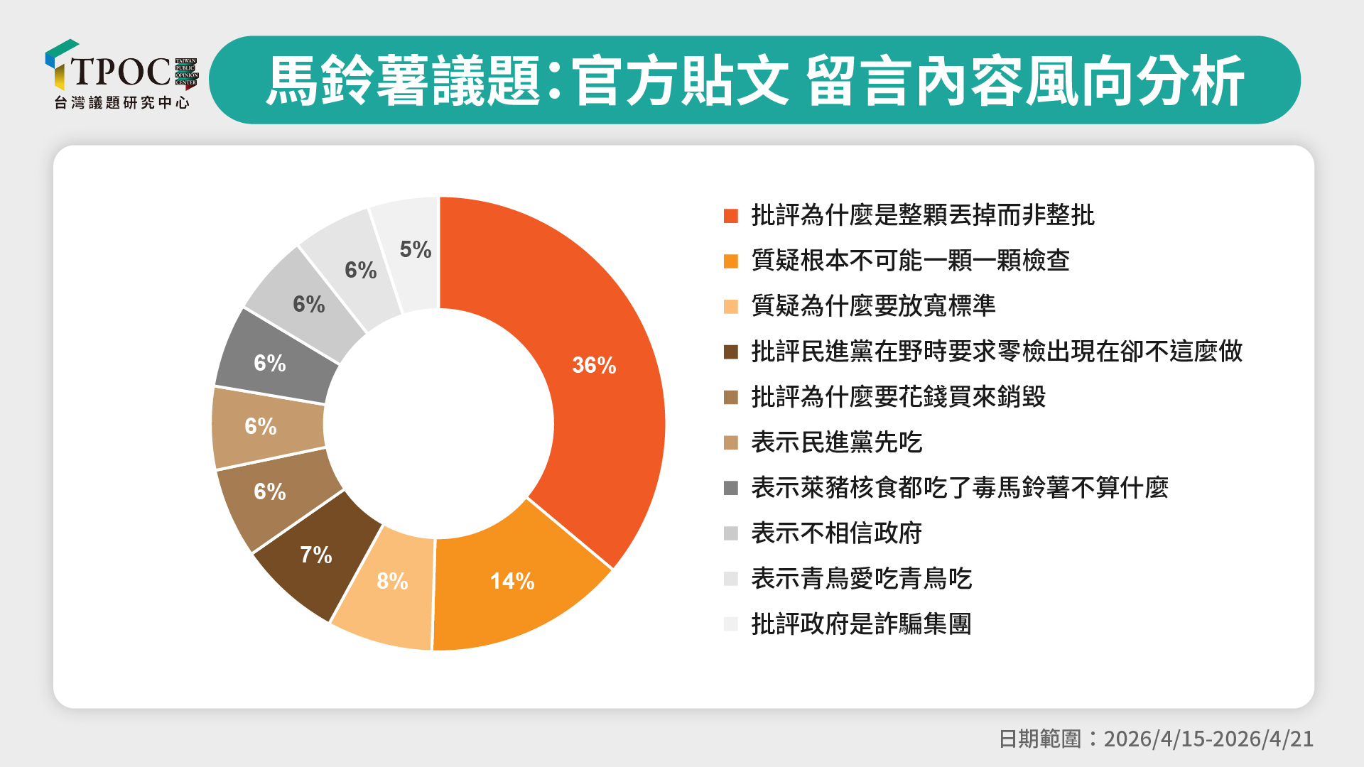 進一步針對民進黨官方、農業部及衛福部臉書澄清文底下的留言風向分析,數據顯示,聲量佔比最高、達 36.1% 的聲量均集中於「批評為什麼是整顆丟掉而非整批退回」。對民眾而言,過去的「整批零容忍」是守護食安的最後防線,政府將檢疫標準從「整批銷毀」改為「專廠挑選剔除」,在民眾心理被直觀視為「食安標準的退步」。另有14.4%的聲量質疑「根本不可能一顆一顆檢查」。這顯示民眾對於政府聲稱的「逐顆檢查」與「加工廠監督」缺乏實務上的信心。在龐大的貿易量前,民眾普遍對「人力剔除」的嚴謹度抱持高度懷疑。