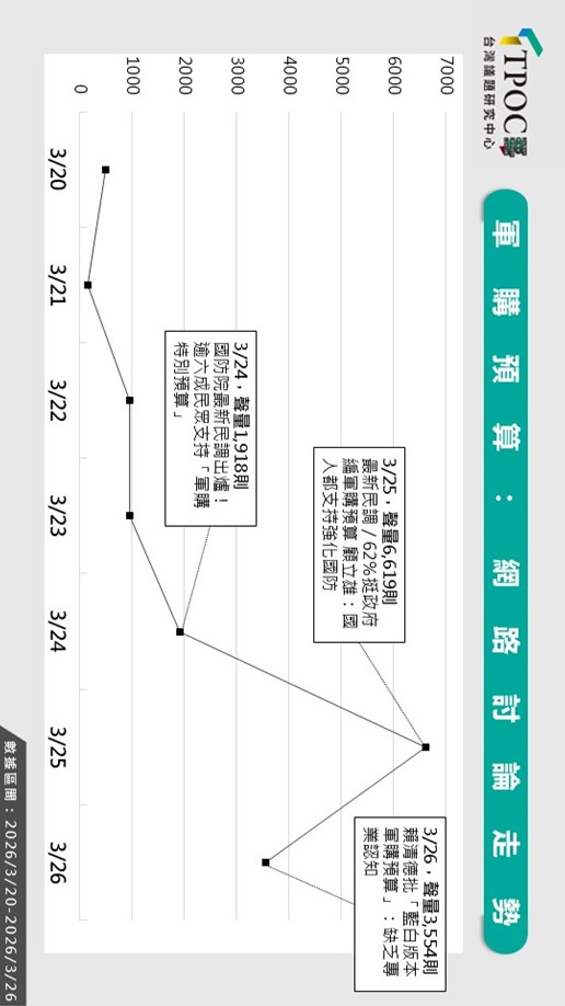 根據TPOC網路討論走勢圖,軍購議題在 3 月 24 日前處於低迷期,但在 3 月 25 日 因國防院發布「62% 民眾支持軍購特別預算」的民調,配合國防部長顧立雄「以實力取得和平」的發言,聲量瞬間衝破 6,619 則。