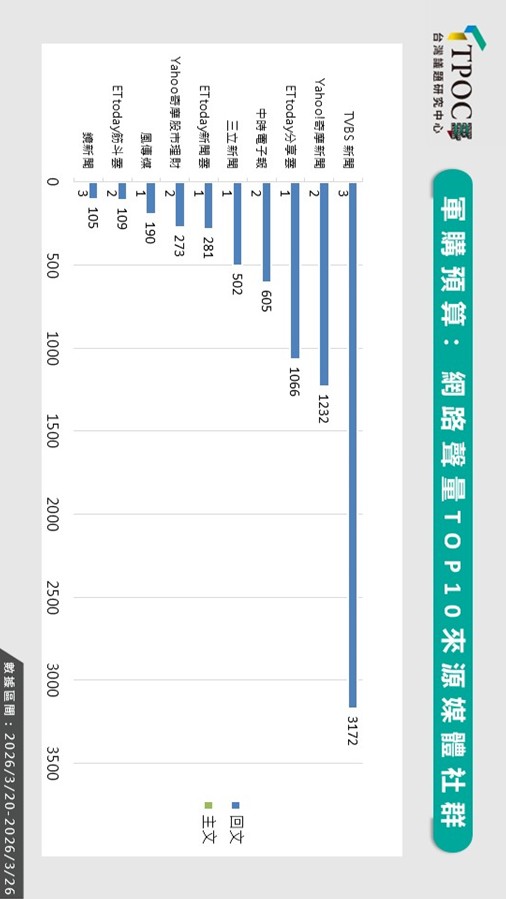 在來源媒體分析中可以見,TVBS 新聞 以 3,172 則 回文聲量斷層式領先,其次為 Yahoo!奇摩新聞1,232 則與 ETtoday 系列平台。雖然數據顯示各大媒體的主要新聞發文僅個位數,但回文數極高。這反映在臉書社群媒體中,軍購議題極易觸動網民神經,且各新聞留言區板塊已成為高度極化(Polarized)的戰場。且TVBS 與 Yahoo! 的高聲量,暗示了對軍購持保留或審慎態度的群眾(主要為藍白支持者或中間選民)在此議題中網路聲量佔據主動權,這與民調數據呈現的「達六成民眾支持」在觀感上產生落差。