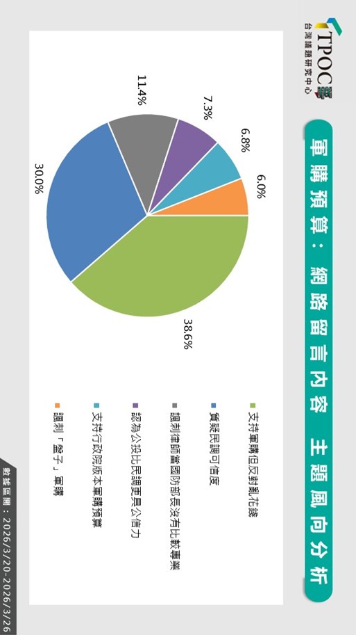 隨著立法院外交及國防、財政委員會近期針對「強化防衛韌性及不對稱戰力計畫採購特別條例草案」展開朝野併案審查,軍購預算再度成為台灣輿論場的攻防核心。根據台灣議題研究中心(TPOC)最新大數據分析顯示,儘管官方民調呈現「六成民意支持」基調,但網路社群聲量結構卻呈現更為複雜且充滿張力的民意斷層。