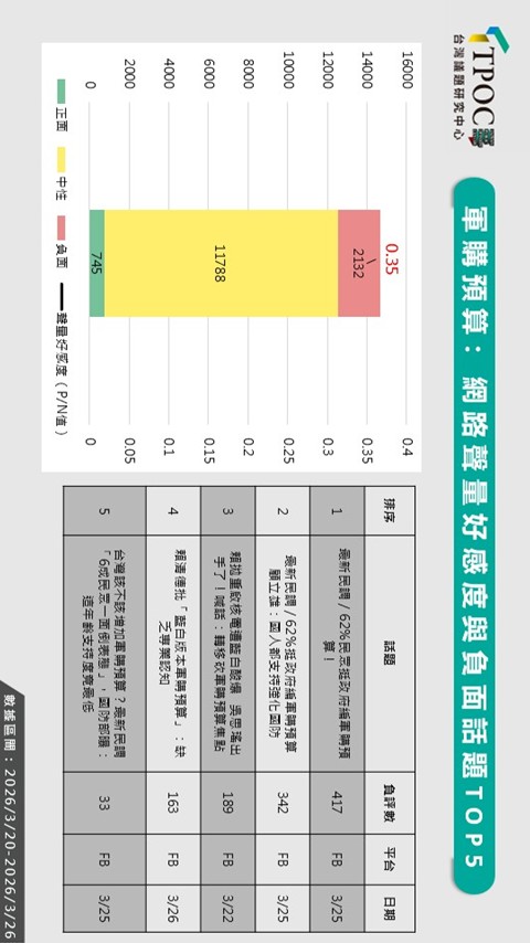 從網路好感度觀察,軍購預算議題的好感度僅0.35,負評高達2,132則,幾乎是正評(745則)的三倍。多聚焦於預算編列透明度不足,以及對執政黨施政能力的質疑,網友雖認同國防重要性,但對行政院版本的軍購支出抱持高度審慎態度。