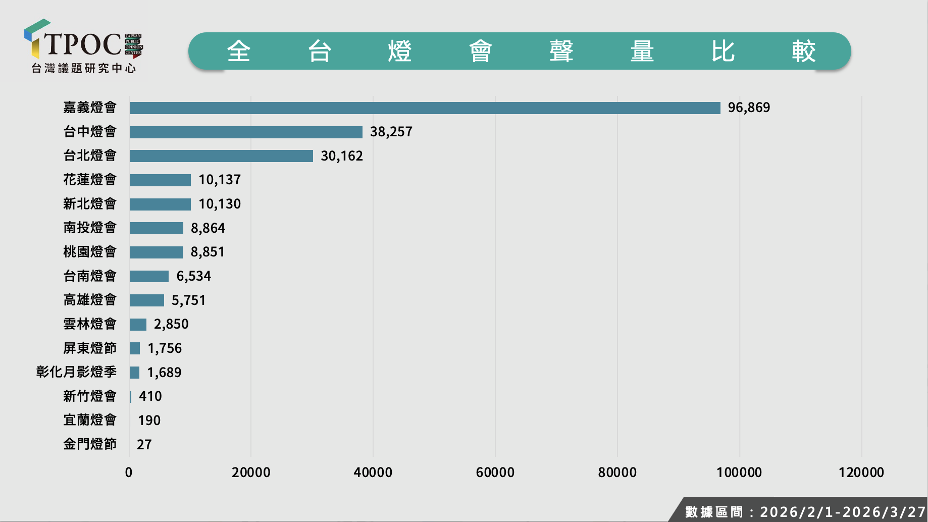 從「全台燈會聲量比較」數據顯示,嘉義燈會以 96,869 筆的總聲量穩居冠軍寶座,大幅領先第二名台中燈會的38,257 筆與第三名台北燈會的 30,162 筆。
