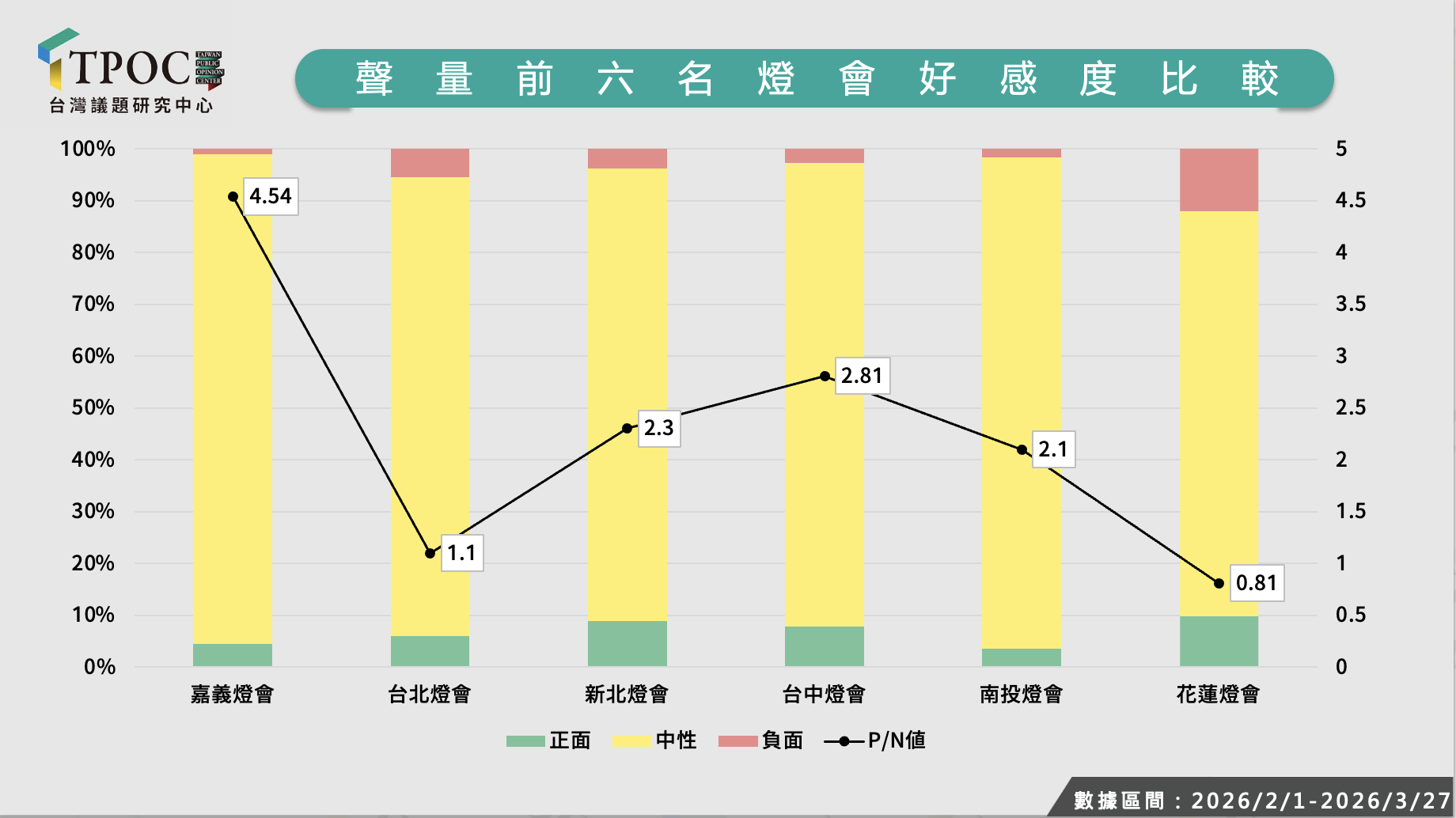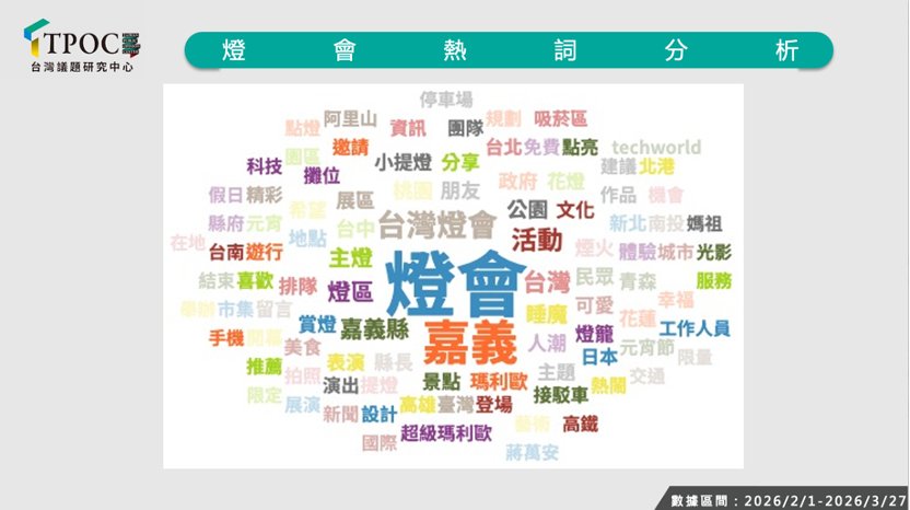 2026 年全台各縣市燈會活動陸續圓滿落幕,每年元宵節期間的「燈會大戰」總是各地方政府展現觀光實力的重要指標。根據 TPOC 台灣議題研究中心最新公布的數據(數據區間:2026/2/1 - 2026/3/31),今年的全台燈會網路輿情呈現出明顯的板塊差異,其中「嘉義燈會」以壓倒性的討論度與極佳的正面評價,成為今年度最受矚目的焦點。