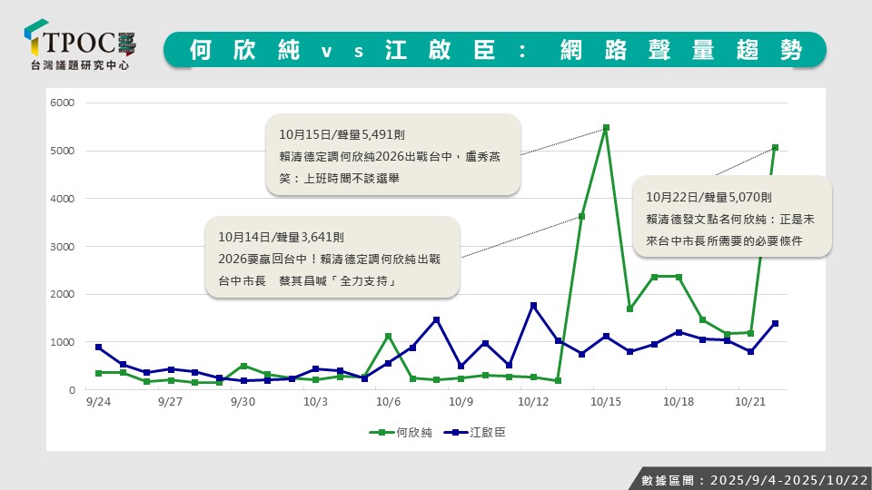 不過到了10月14日,民進黨建議中執會徵召何欣純參選2026台中市長,蔡其昌也表態「全力支持」,聲量瞬間飆升至3,641則,大幅超越對手江啟臣(1,122則)。隔日討論延續至高峰5,491則,社群開始出現「誰有能力領導台中」的討論,期間現任台中市長盧秀燕則回應「上班時間不談選舉」,進一步引發網路熱議。10月22日,民進黨通過第一波2026年縣市長提名人選,賴清德也在社群發文肯定何欣純的經歷「正是未來台中市長所需要的必要條件」,再度拉抬網路聲量,當日討論來到5,070則。