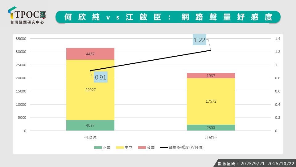 整體而言,何欣純在獲得黨內正式認可後,聲勢有明顯上升,網路熱度逐漸增溫。不過在好感度方面,與國民黨多位核心人物關係密切的江啟臣仍略居上風。接下來,何欣純能不能把中央支持轉化成地方人氣,進一步累積網路好感;而江啟臣又能否穩住藍營基本盤、吸引更多中間選民,強化團結形象,將成為2026台中市長選戰的觀察重點。