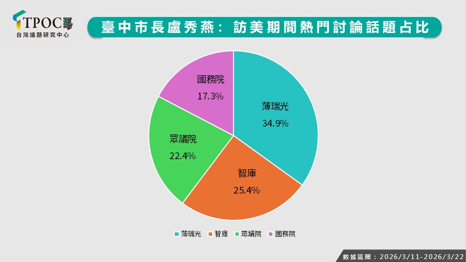 此外,與美國智庫「外交關係協會(CFR)」的深度交流也占了 25.4% 的聲量,反映民眾對台美實質互動的高度關注。值得注意的是,拜會聯邦眾議員(22.4%)及國務院與戰爭部高層官員(17.4%)的行程中,盧秀燕毫不避諱地觸及軍購等敏感議題,此舉極具戰略意義,有效消弭了外界對藍營「疑美論」的質疑,進一步鞏固其穩健的外交立場。