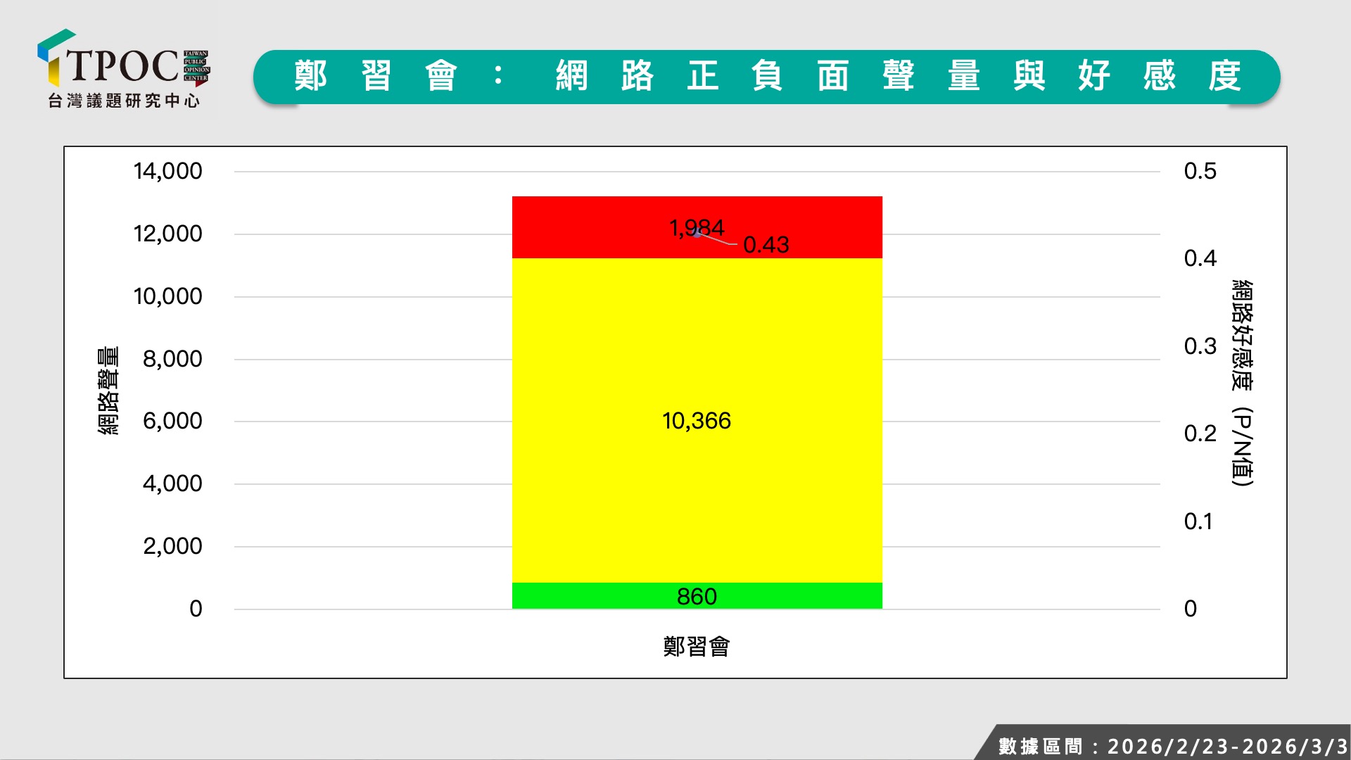 儘管目前國民黨內部有一派說法,認為若鄭習會成行,將有助於穩定兩岸局勢,並為今年地方選舉加分。可是,單從網路數據面觀察,鄭麗文上任後的網路聲量可說是「開高走低」,雖然打出兩岸牌,依然未能轉換為實質聲量,遑論藉此凸顯她的政治領導能力。另一個需要注意的點是,鄭麗文在兩岸議題上的網路好感度偏低,若繼續強化鮮明「親中」色彩,反而可能嚇跑中間選民及年輕族群,使他們產生排斥感。究竟鄭習會這張牌,有沒有機會為國民黨挹注選舉紅利?恐怕仍有不小考驗得持續觀察。