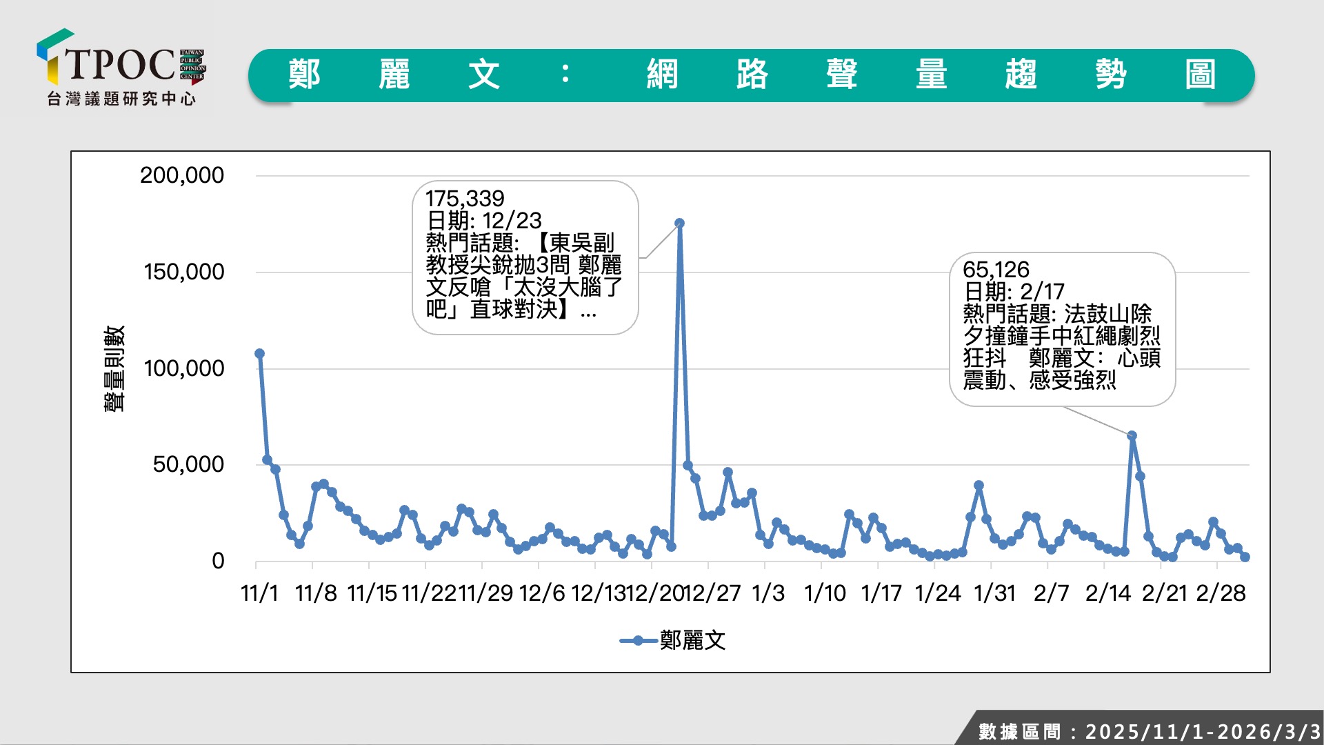 透過觀察網路聲量趨勢圖也發現,鄭麗文自去年11月上任以來,整體聲量呈現每月下滑態勢,去年11、12月每月聲量還能維持在75.4萬至67.4萬則之間,但1月後聲量迅速「消風」,出現斷崖式下滑至39.3萬則。且若細究當中的熱門話題,多數仍集中在花邊新聞、爭議新聞上,例如鄭麗文去東吳大學政治學系演講批提問「這也太沒有大腦了吧?」,或者出席法鼓山除夕撞鐘活動時手中紅繩劇烈狂抖動等,整體而言並未能穩定輸出具備社會號召力的政策議題,而且在國共論壇登場、釋出鄭習會消息前後,聲量起伏變化也不大,顯示目前這兩個議題並沒有幫助她的聲量成長。