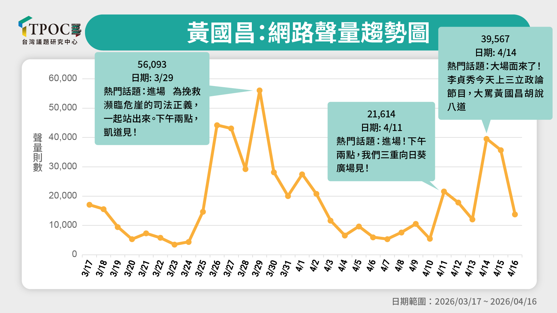 觀察黃國昌近一個月的網路聲量趨勢,其聲量的第一波高峰出現在3月29日,當天熱門話題為黃國昌號召凱道集會挽救司法正義,單日聲量衝上56,093 則,為近一個月最高峰。隨後,他的聲量轉為消沈,直到4月11日黃國昌於三重舉辦「讓新北更有型」造勢活動,創造一波聲量高峰,當天聲量21,614 則。不過,隨著李貞秀上政論節目「大場面」反擊,黃國昌的聲量連日飆升,4月14日單日衝上 39,567 則。可以發現,李貞秀引發的內鬨聲量,竟然比黃國昌精心規劃的新北首場造勢活動高出近1.8 倍。這顯示大眾對黃國昌競選新北市長的關注度,遠低於對白營內鬥的關注,對於黃國昌而言,這種聲量結構極其不健康。