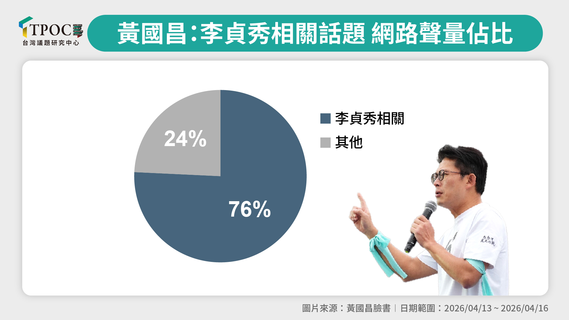 進一步分析近日黃國昌的聲量組成,其網路發言權呈現嚴重的失衡。在短短四天內,與「李貞秀相關」話題的聲量高達 77,024 則,佔比達75.7%,而與參選、市政相關的話題僅剩 24.3%。數據證實,黃國昌正陷入「被動防禦」的困境。李貞秀發起的攻勢讓黃國昌被李貞秀「牽著鼻子走」,導致黃國昌2026 新北市長的布局聲量慘遭稀釋,難以將討論主軸拉回競選與政見本身,對爭取中間選民的支持極為不利。