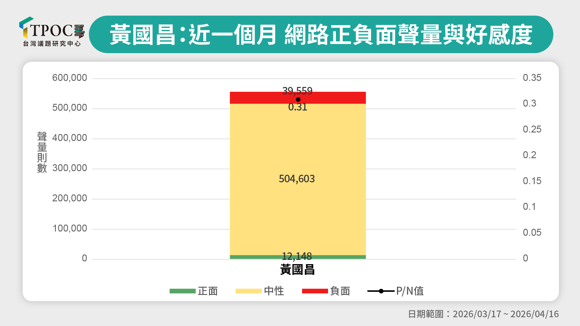 而觀察黃國昌近一個月的好感度表現,其P/N 值僅為0.31,負面聲量39,559 則遠高於正面12,148 則。分析熱門負面話題顯示,網友關注李貞秀公開叫陣要求「公布錄音」與「會議紀錄」,指控黃國昌「一派胡言」,雙方對於「討錢補償」的說詞南轅北轍,成為熱門話題。這種互指對方說謊的「泥巴戰」在社群中獲得高度擴散,讓黃國昌在近期的公眾視野中難以切換至具備執政穩定感的縣市長參選人角色。