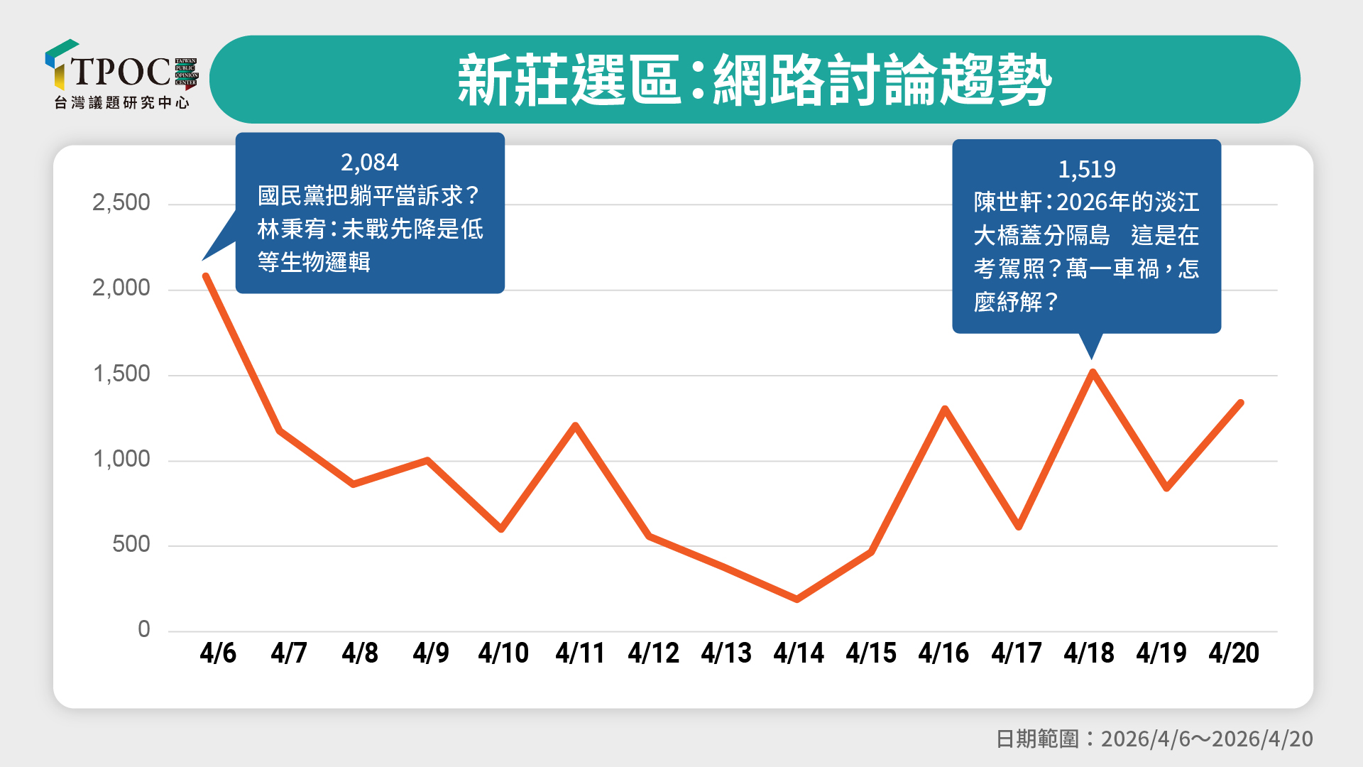 新莊選區近兩週的討論趨勢呈現多次波動,並出現數個明顯高峰。其中,4月6日達到最高點(2,084則),主因為現任議員林秉宥於臉書抨擊國民黨「躺平說」,直言「未戰先降是低等生物邏輯」,引發廣泛討論。林秉宥另篇貼文批評若由王世堅參選台北市長將是「奇恥大辱」,也進一步推升社群熱度。