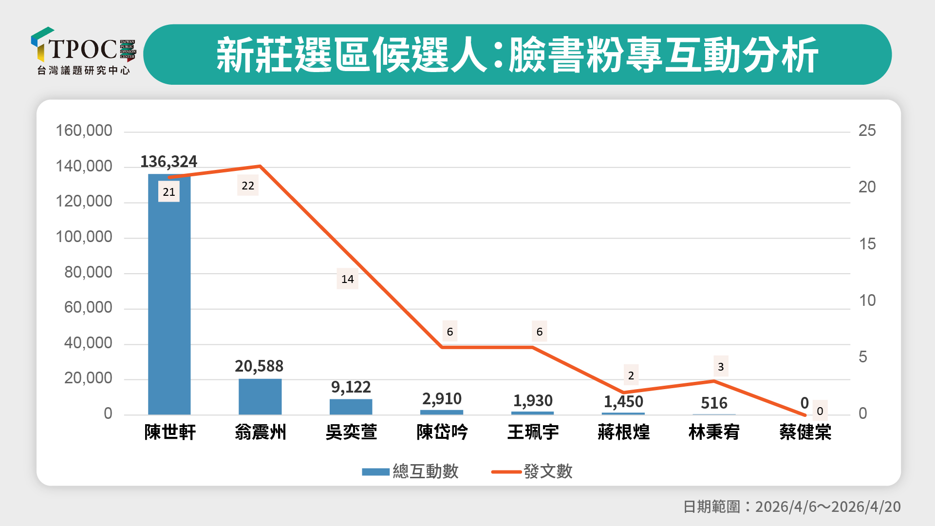 進一步分析幾位候選人在臉書粉專的社群數據可發現,陳世軒過去兩週共發布21則貼文,累積互動數達136,324次;相較之下,翁震州雖發布22則貼文,但互動數僅20,588次。整體來看,陳世軒的貼文在互動表現與擴散效果上皆明顯較為突出,其中以譴責柯文哲遭噴辣椒水事件相關貼文互動數最高,另持續更新橋梁與公園改建進度的貼文亦獲得廣泛回響。