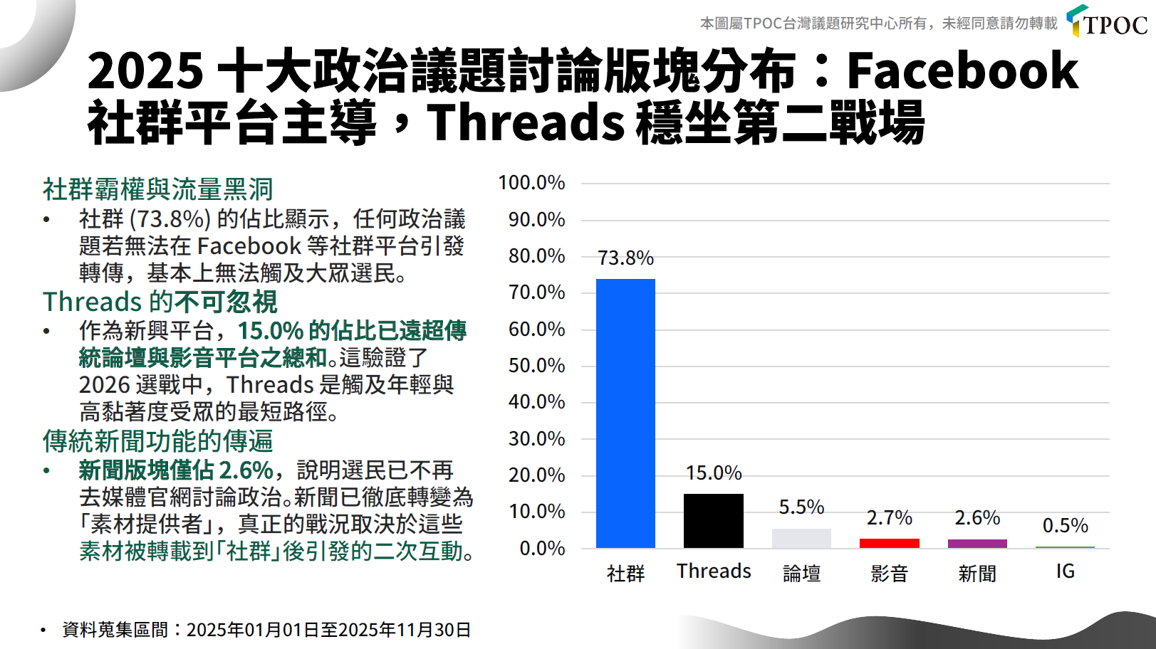 綜合觀察可見,2025年的焦點政治議題呈現高度對立,且多與民生密切相關,其中「大罷免」更成為政治攻防與動員的核心主軸。另一方面,輿情版圖的生態亦出現明顯轉變,儘管傳統社群平台仍是政治討論的穩固基礎,Threads的爆發式成長也已不容忽視,逐步成為觸及年輕族群與高政治黏著度受眾的關鍵場域。面對即將到來的2026年選舉,如何因應輿論戰場的轉移、善用不同平台的特性發揮影響力,將成為政治溝通與議題設定的關鍵。