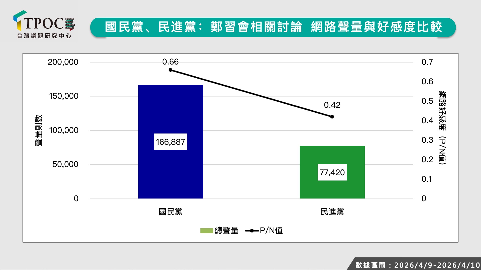 TPOC 台灣議題研究中心透過QuickseeK快析輿情資料庫觀察發現,儘管執政黨與行政單位發動多線回擊,但在大數據輿情戰場上,藍營不僅聲量全面碾壓,更成功將「和平避戰」鎖定為輿論核心。觀察4月9日至10日兩黨在「鄭習會」議題下的聲量表現,國民黨展現了壓倒性的空戰動能。數據顯示,國民黨的總聲量高達166,887 則,規模約為民進黨77,420則的 2.1 倍。