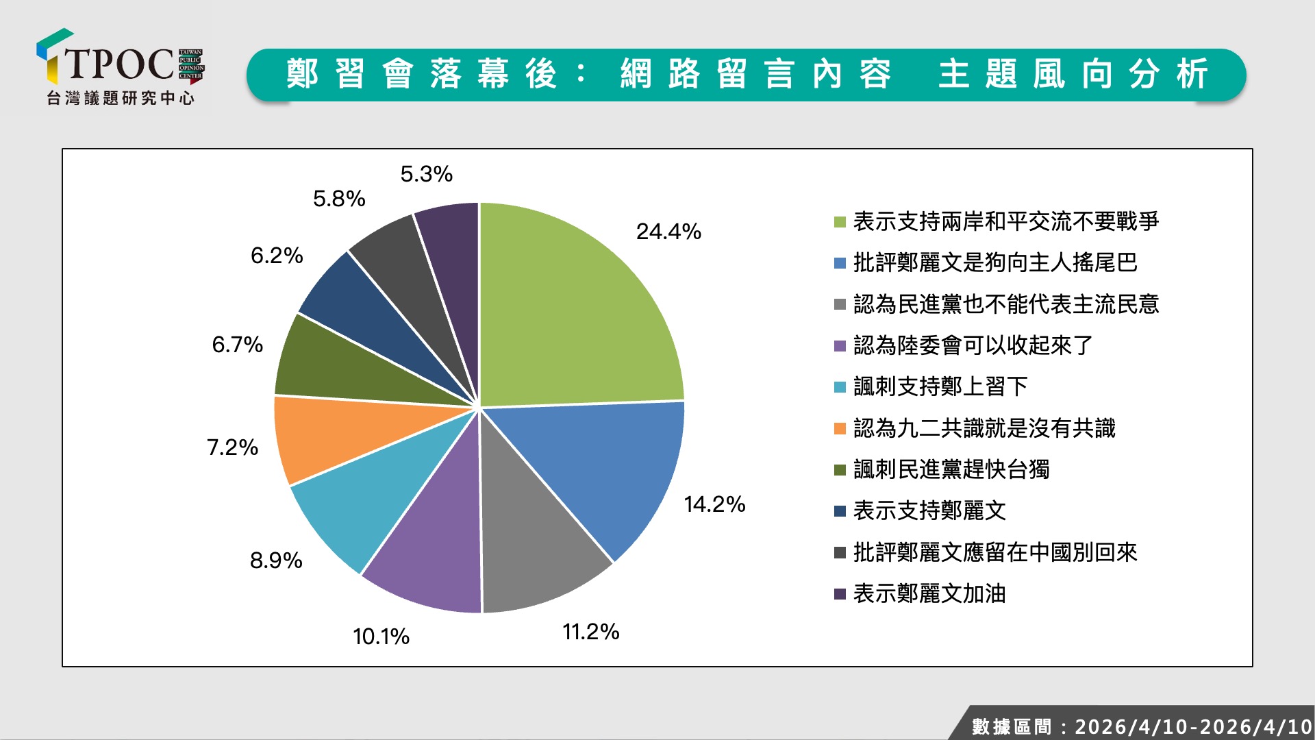分析4月10日鄭習會落幕後的全網留言面向,在十大主要留言主題風向中,「表示支持兩岸和平交流不要戰爭」以24.4%的聲量佔比高居第一。而對執政黨的批評包含「認為民進黨也不能代表主流民意」(11.2%)、「認為陸委會可以收起來了」(10.1%),以及「諷刺民進黨趕快台獨」(6.7%)。支持鄭麗文立場的討論則包含「表示支持鄭麗文」(6.2%)、「表示鄭麗文加油」(5.3%)。然而,數據也顯示網路存在對鄭麗文個人的批評,如「批評鄭麗文是狗向主人搖尾巴」(14.2%)、「諷刺支持鄭上習下」(8.9%)、「批評鄭麗文應留在中國別回來」(5.8%),也有人「認為九二共識就是沒有共識」(7.2%)。不過總體而言,支持對話交流、批評執政黨兩岸僵局的聲量佔據了絕對優勢,這反映出民間對於「和平避戰」的訴求,已成為近期輿情討論的主流風向。