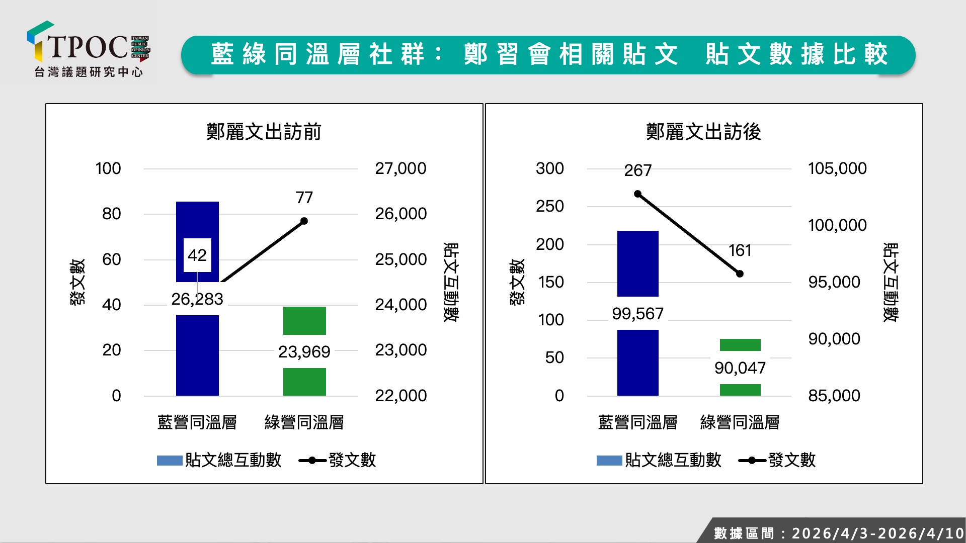 此外,針對鄭麗文出訪前,部分人士擔憂此行將衝擊 2026國民黨選情的質疑,數據給出了截然不同的答案。比較鄭麗文出訪前後(4/3-4/6 vs. 4/7-4/10)藍綠同溫層社群的討論熱度,藍營內部士氣呈現「爆發式成長」。藍營同溫層方面,發文數由出訪前的42 則暴增至267則,成長逾6倍,貼文總互動數更衝上99,567次。至於綠營同溫層,雖然互動數隨議題升溫,但在發文頻率與粉絲能量上已遜於藍營,其總互動數約9 萬次。這顯示鄭麗文出訪不僅未造成負面衝擊,反而成功將兩岸議題轉化為藍營的空戰主場,使原本觀望的基層能量在短時間內高度凝聚。