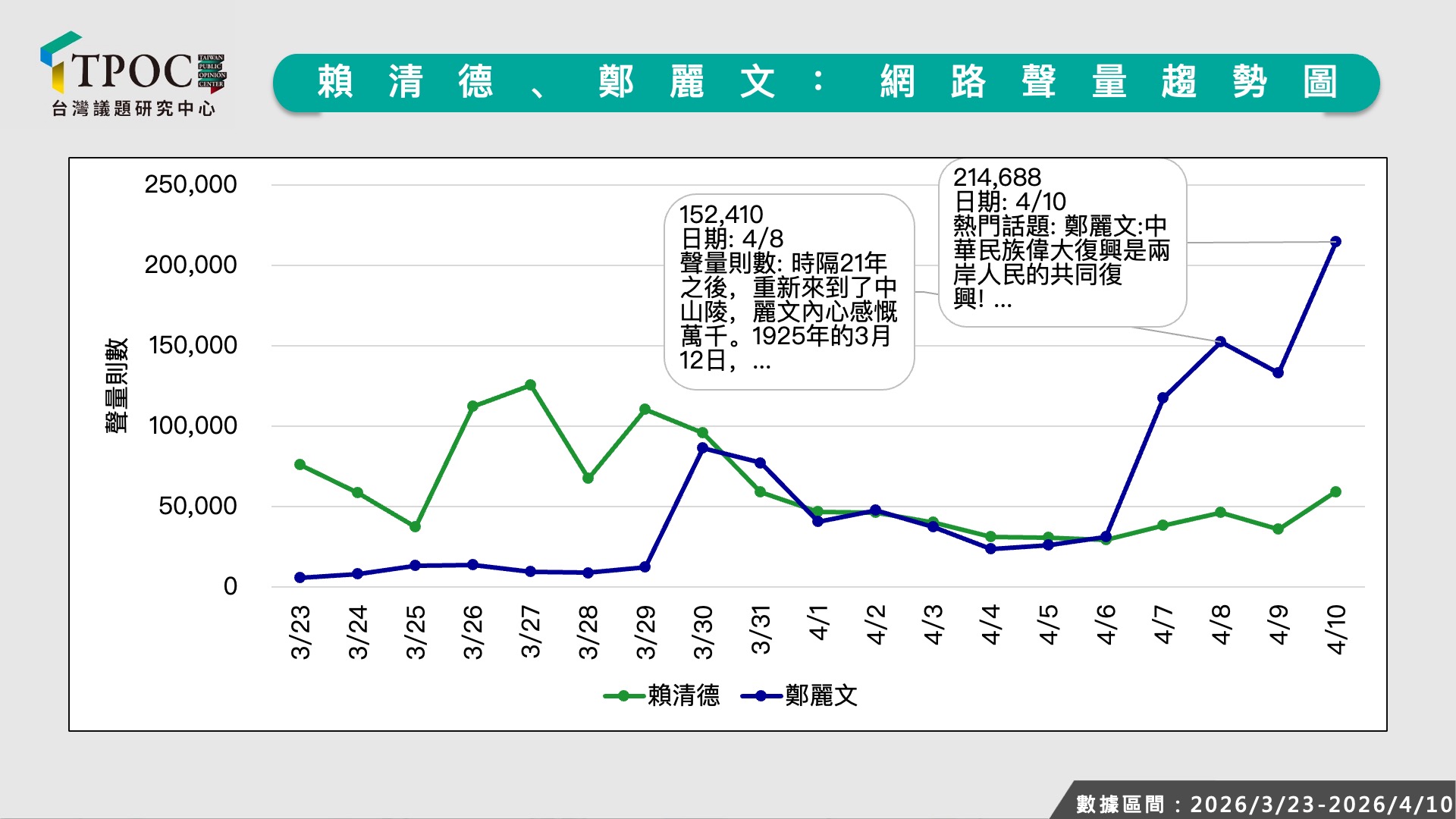 最後,比較鄭麗文與總統賴清德的網路聲量趨勢。自鄭麗文開啟訪中行程後,其個人聲量出現爆炸性成長。數據顯示,在4月7日後的連續多日至今,鄭麗文的單日聲量連續5天皆顯著超越賴清德。特別是在10日當天,鄭麗文單日聲量衝破20萬大關,反觀賴清德僅有5.9 萬則,兩人差距高達3.4倍。由於賴清德身為國家元首與民進黨黨主席,在此期間並未針對「鄭習會」有直接強力的回應,多由行政單位與黨團成員在第一線回擊。這種策略導致他在此議題上顯得「被邊緣化」。對比鄭麗文在對岸的高曝光與強勢議題設定,執政黨在此段時間顯得欲振乏力,兩岸話語權呈現明顯「藍強綠弱」態勢。