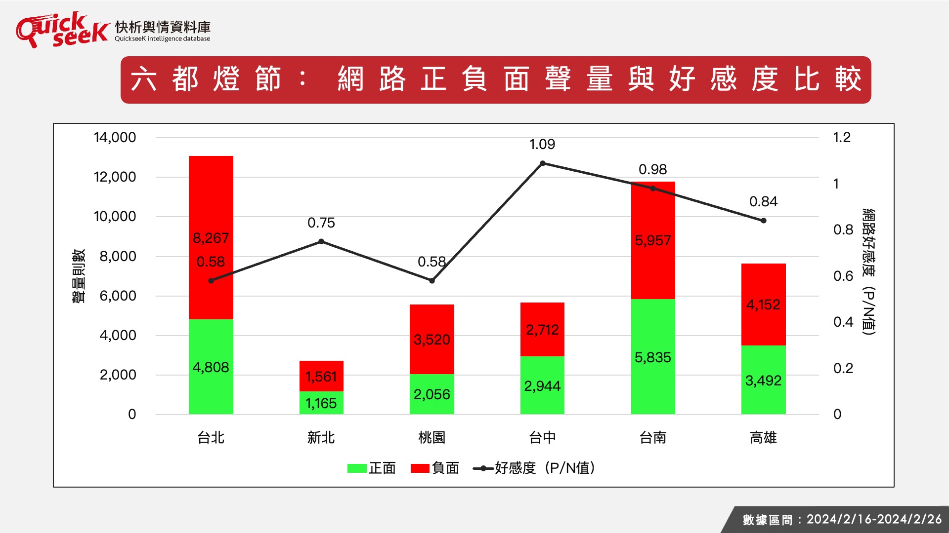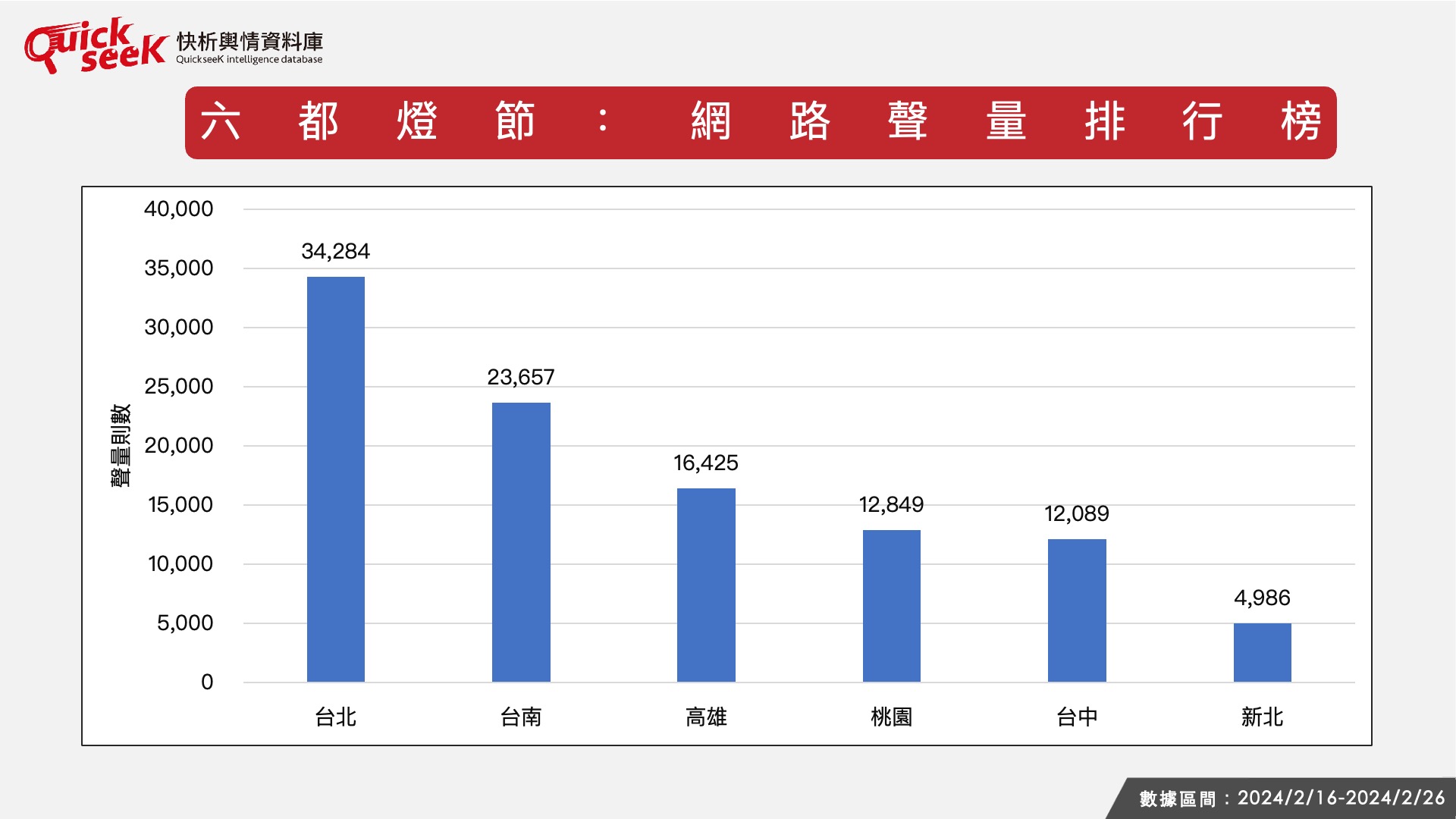 透過QuickseeK快析輿情資料庫比較六都燈會的網路聲量排行,台北市雖非今年台灣燈會的主辦縣市,但首都媒體曝光最高,加上台北燈會的一組參展花燈作品「眾神保庇(龍)平安」引發正反議論,台北市長蔣萬安也特地到場觀賞,並安排受訪,讓整體網路討論度居高不下,3.4萬筆相關話題是六都燈會最高。六都燈會話題排名第二的,是今年主辦台灣燈會的台南市,有2.3萬筆討論;台南除了是今年台灣燈會的主辦方,受矚目程度最高,加上也有具話題性的「陳守娘」花燈,與台北的花燈一併受到討論。