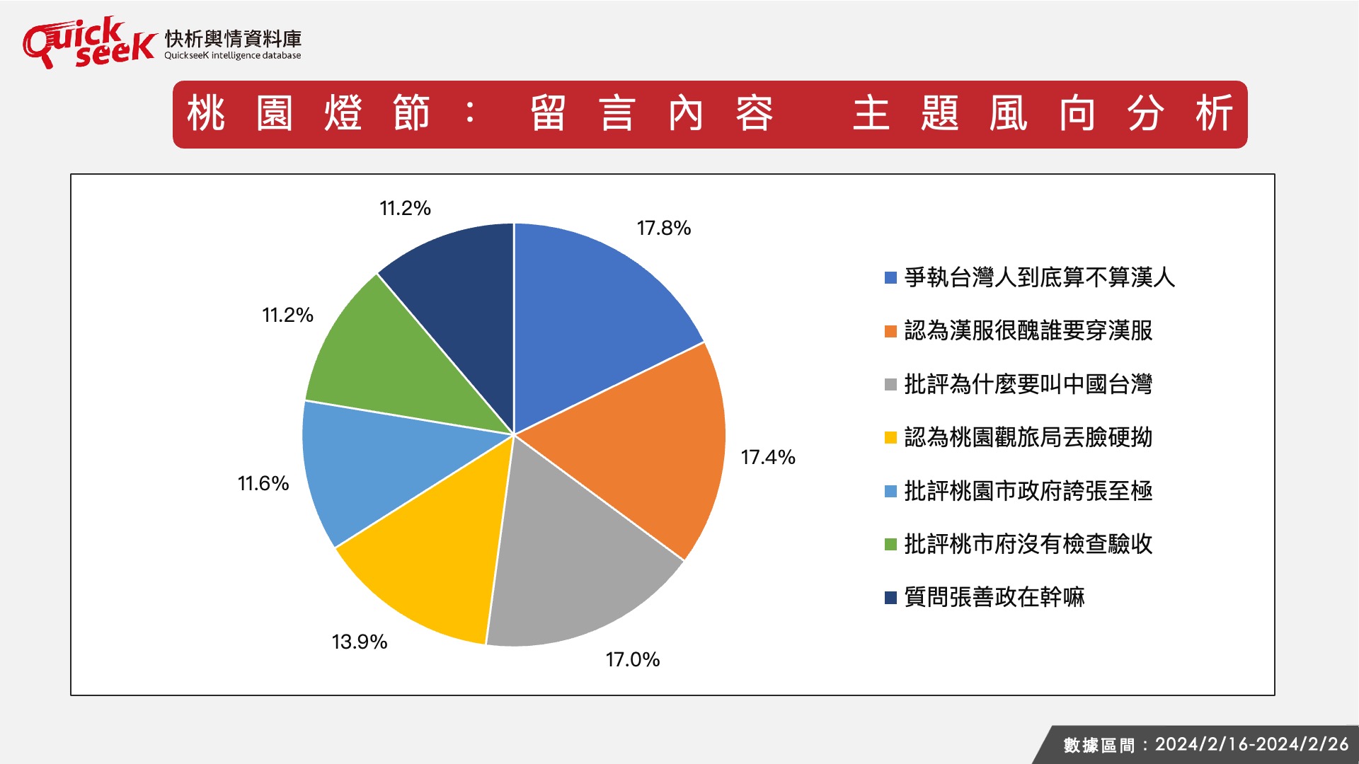 相較於台北燈會是因主觀審美問題引發討論,桃園燈會的討論就顯得政治味濃濃。分析網友對於桃園燈會的討論內容,有17.8%的網友在爭執「台灣人到底算不算漢人」,17.4%網友聚焦討論「漢服很醜,誰要穿漢服」,17.0%網友批評宣傳影片「為什麼要叫中國台灣」,13.9%網友認為「桃園觀旅局丟臉硬凹」,11.6%網友批「桃園市政府誇張至極」,11.2%網友責難「桃市府沒有檢查驗收」,11.2%網友質問「張善政在幹嘛」。