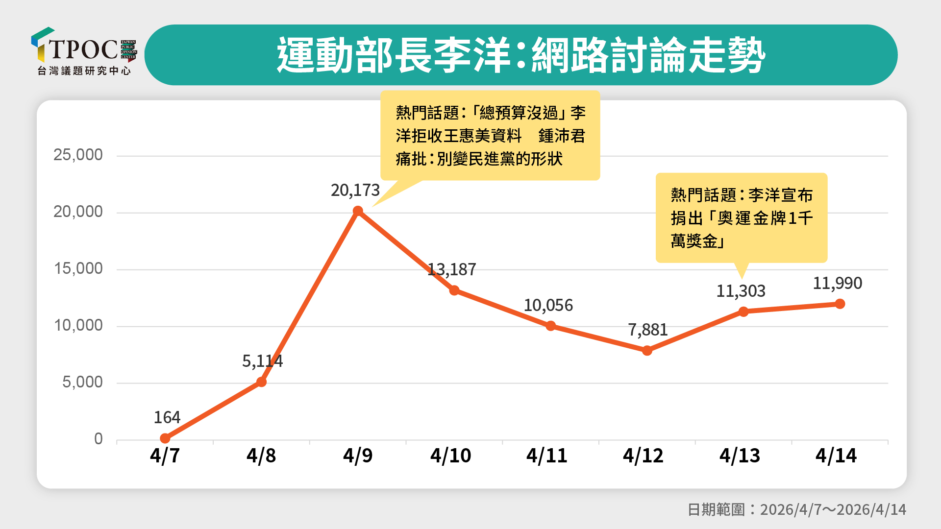 聲量數據顯示,李洋在過去一週的討論熱度明顯攀升。4月7日僅164則討論,至8日即快速躍升至5,114則。當日李洋於公開場合婉拒收受王惠美所遞交的計畫書,並以「總預算沒有通過」說明,引發外界關注與解讀。相關話題隨後延燒,藍營議員鍾沛君亦表示「別變成民進黨的形狀」,使討論進一步升溫,並於9日達到高峰(20,173則)。在政治攻防升溫的同時,運動部次長鄭世忠請辭消息傳出,且李洋據悉為臨時接獲通知,也使外界對人事變動產生揣測。