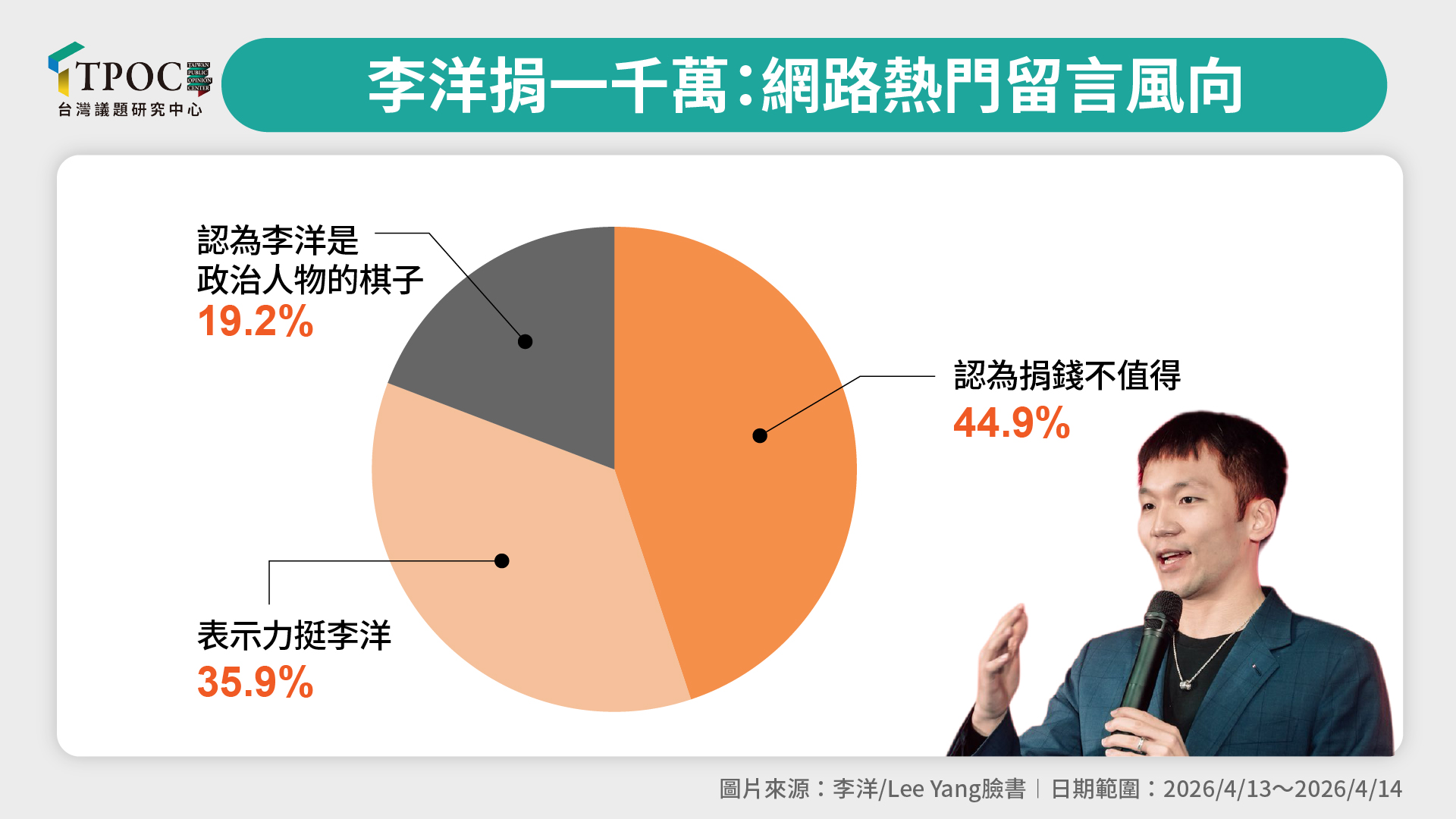 運動部長李洋近期頻頻躍上新聞版面,從拒收彰化縣長王惠美文件、運動部次長請辭,到自掏腰包捐出一千萬元獎金,多起事件接連發酵,引發網路高度關注。TPOC台灣議題研究中心透過QuickseeK快析輿情資料庫,觀察李洋近一週的網路聲量與討論風向,發現輿論並未因其慷慨捐款而全面轉向,仍有約 45% 的熱門留言認為其「捐錢不值得」,反映大眾認為這項決定過於衝動,且無助於解決近期爭議,並指其個人善行與施政表現是兩回事。