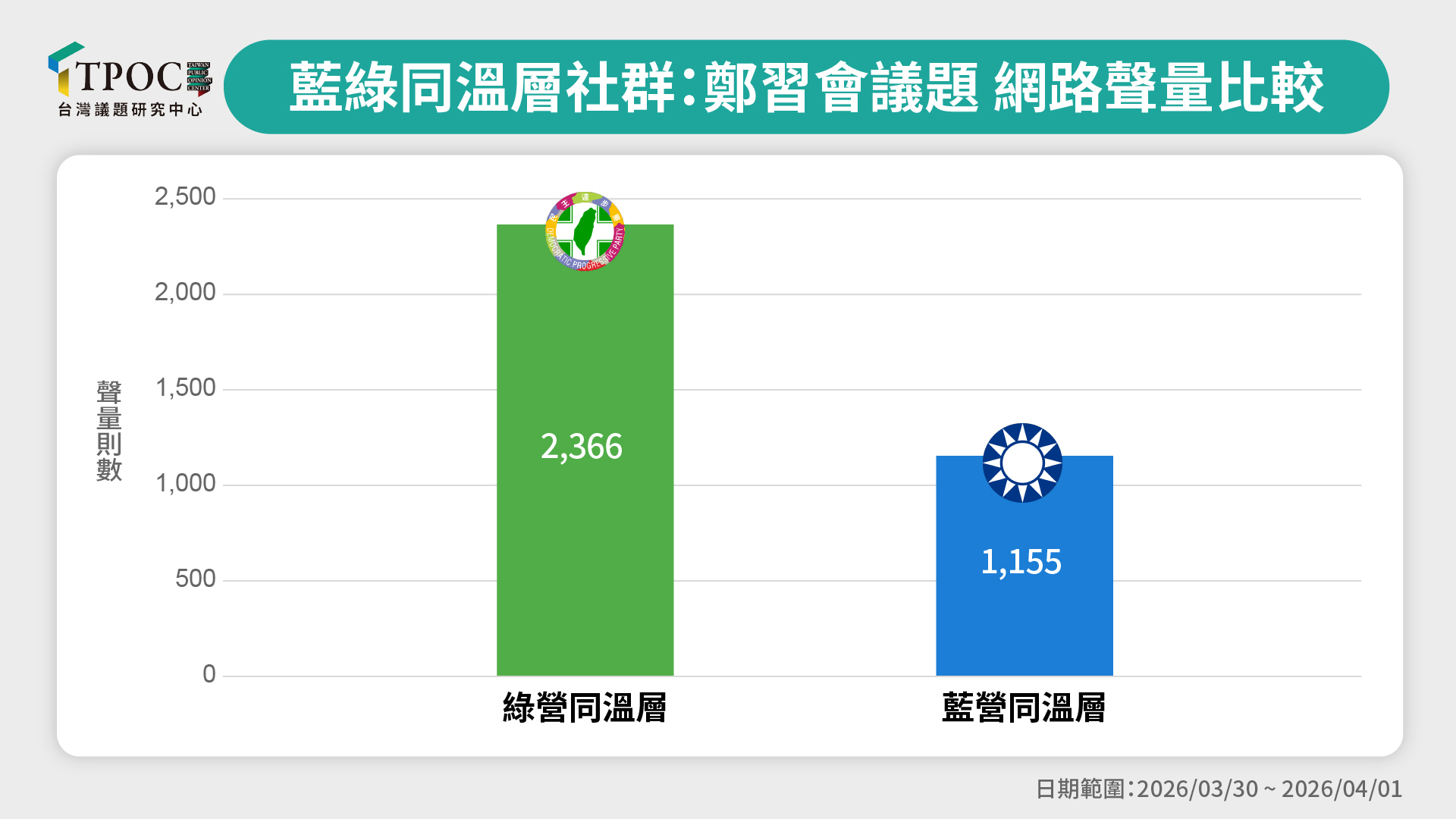 然而進一步解析藍綠兩大陣營在社群動員上的表現,數據則呈現出明顯的不對稱現象。綠營同溫層的討論聲量(2,366 則)為藍營(1,155 則)的兩倍之多。從兩陣營的熱門話題分析發現,在議題設定上,綠營精準地定調「功課牌」,要求鄭麗文在出國前應先處理國內軍購與國安法案。熱門話題內容包含:「要出國玩,先繳作業!軍購、總預算、國安法案先做好再上路」,並指派任務要求鄭當面告知習近平「軍機不要再擾台」。相對地,藍營支持者則主打「不獨不武」的避戰牌,熱門話題集中於:「只要此行可以讓習近平承諾台灣不宣布獨立,中共就不會動武,就成功了」以及「支持兩岸友好」。這種「攻強守弱」的數據分布,反映出綠營在議題主導權上更具侵略性,試圖將會面框架在「逃避國內責任」的論述中。