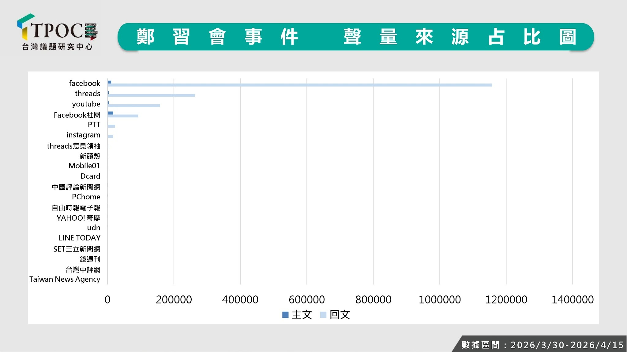 兩岸政壇高度關注的「鄭習會」自3月30日傳出消息以來,至國民黨主席鄭麗文返台期間,在台灣網路空間激起巨大浪潮。根據最新TPOC大數據監測顯示,該事件共創造了1,722,154 筆網路輿論聲量,強勢問鼎台灣4月份話題排行榜冠軍。其中包含新聞報導共14,761篇,本次事件的討論分布廣泛,顯示出不同族群對兩岸議題的高度關切。數據顯示,Facebook(臉書)仍是主要的討論陣地,貢獻了超過 123 萬篇討論;值得注意的是,新興社群平台 Threads 也展現了驚人的爆發力,以 26萬篇聲量位居第二。排行第三為影音YT頻道共創造了158,773篇討論,為台灣4月份最高聲量話題第一名。