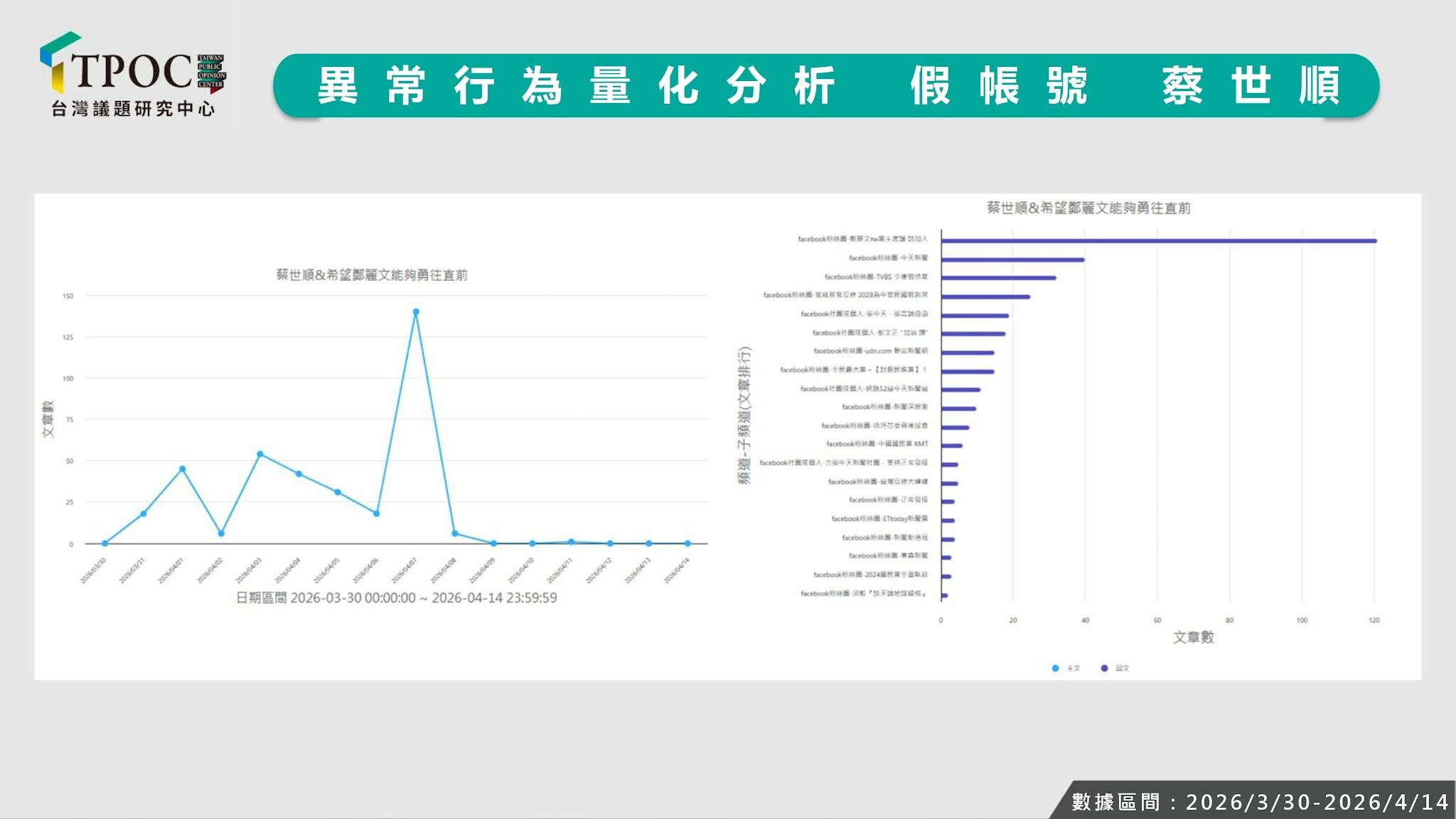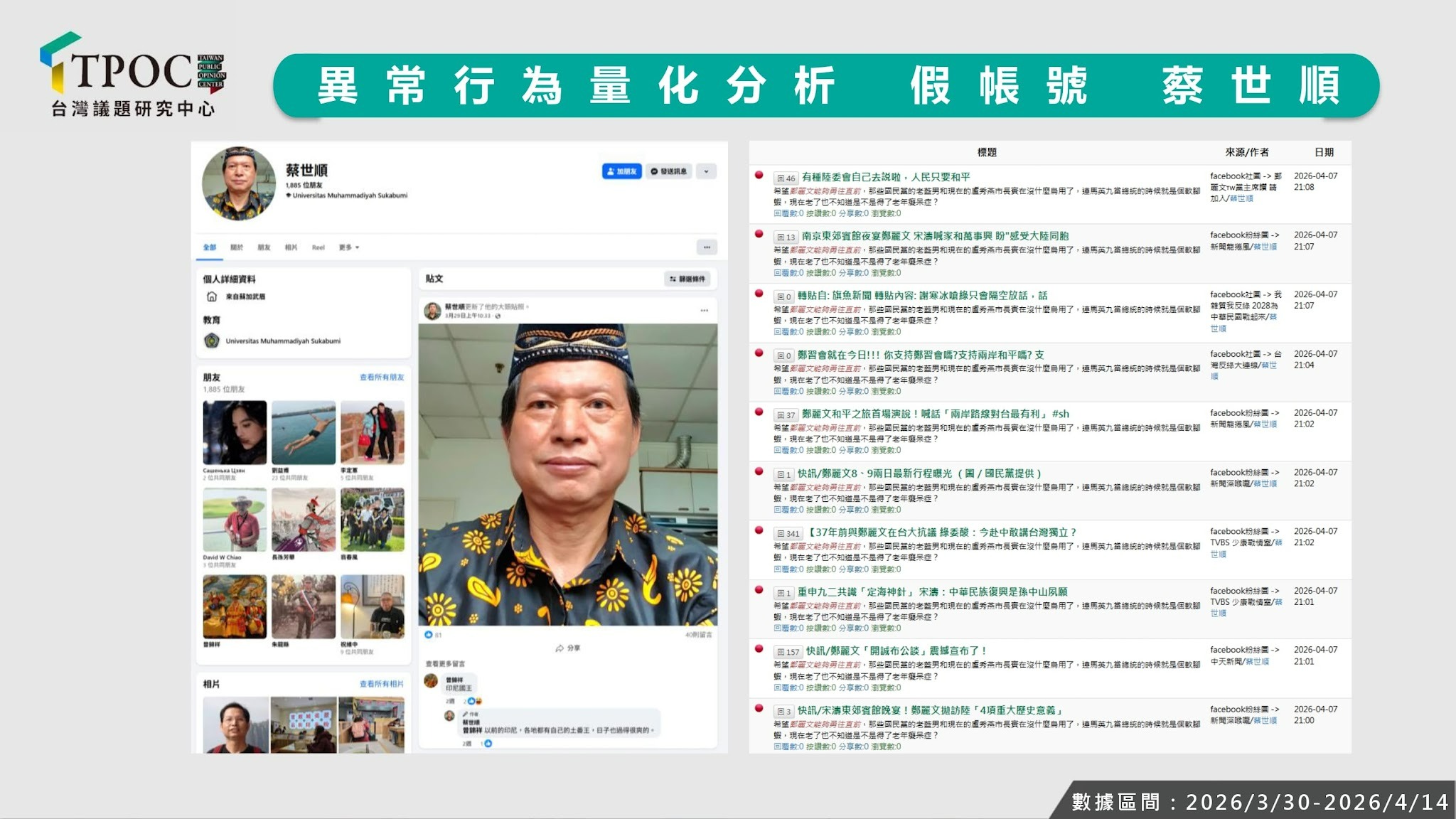在4月7日當天晚上21:00~21:10十分鐘之內,臉書作者(蔡世順)https://www.facebook.com/cai.shi.shun.998991/,在《中天新聞》、《新聞深喉嚨》、《TVBS少康戰情室》、《新聞龍捲風》等4個粉專和《台灣反綠大連線》、《我雜質我反綠 2028為中華民國戰起來》、《鄭麗文🇹🇼黨主席讃 請加入》等3個社團發布了11篇貼文(如「南京東郊賓館夜宴鄭麗文宋濤喊家和萬事興 盼“感受大陸同胞」、「快訊/鄭麗文「開誠布公談」震撼宣布了!」)底下留言,張貼內容為「希望鄭麗文能夠勇往直前,那些國民黨的老藍男和現在的盧秀燕市長實在沒什麼鳥用了,連馬英九當總統的時候就是個軟腳蝦,現在老了也不知道是不是得了老年癡呆症?」的相同留言,且該作者也在其他日在不同粉專的不同貼文底下,亦張貼該相似內容之留言。該帳號多達1884好友,發現其重複發文超過600篇,短時間內的操作量十分可觀。