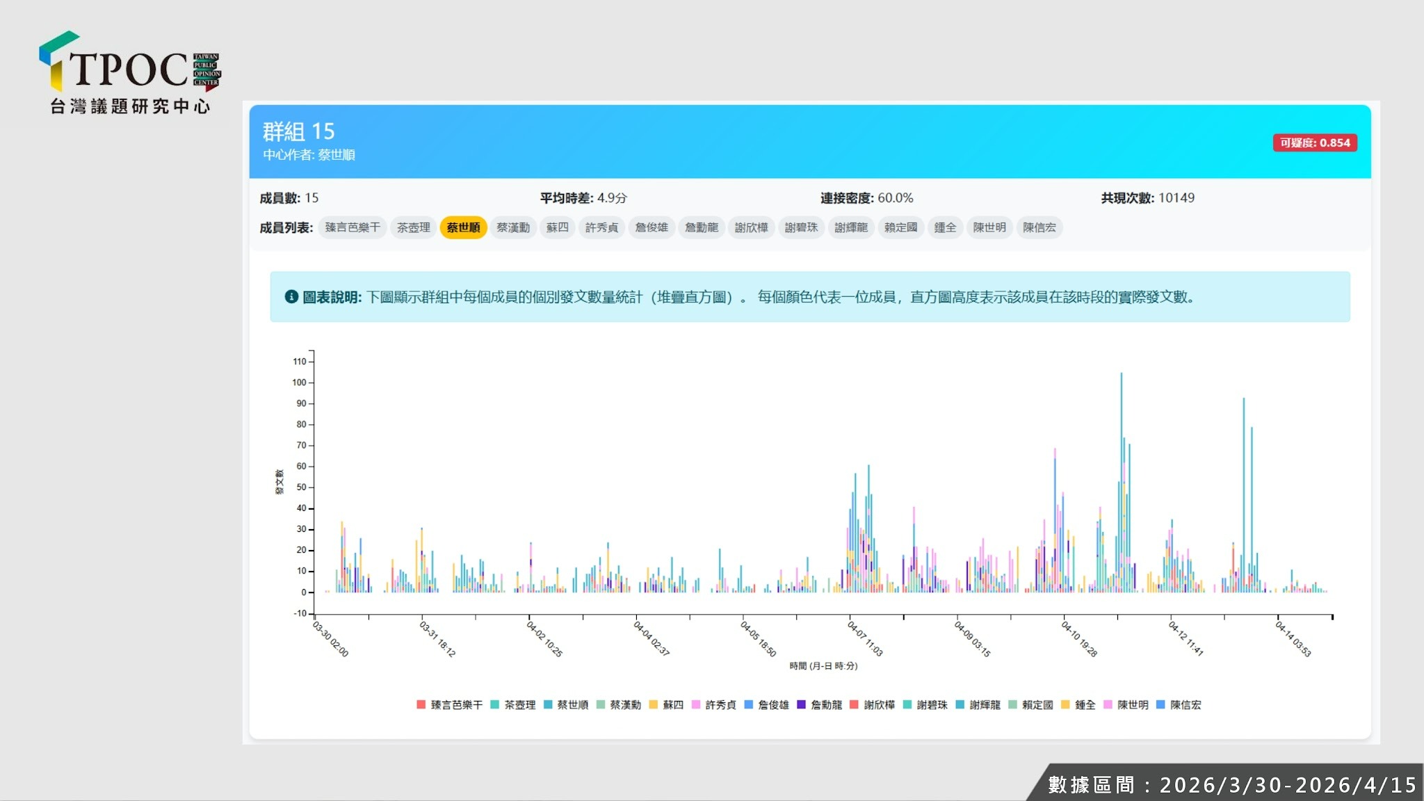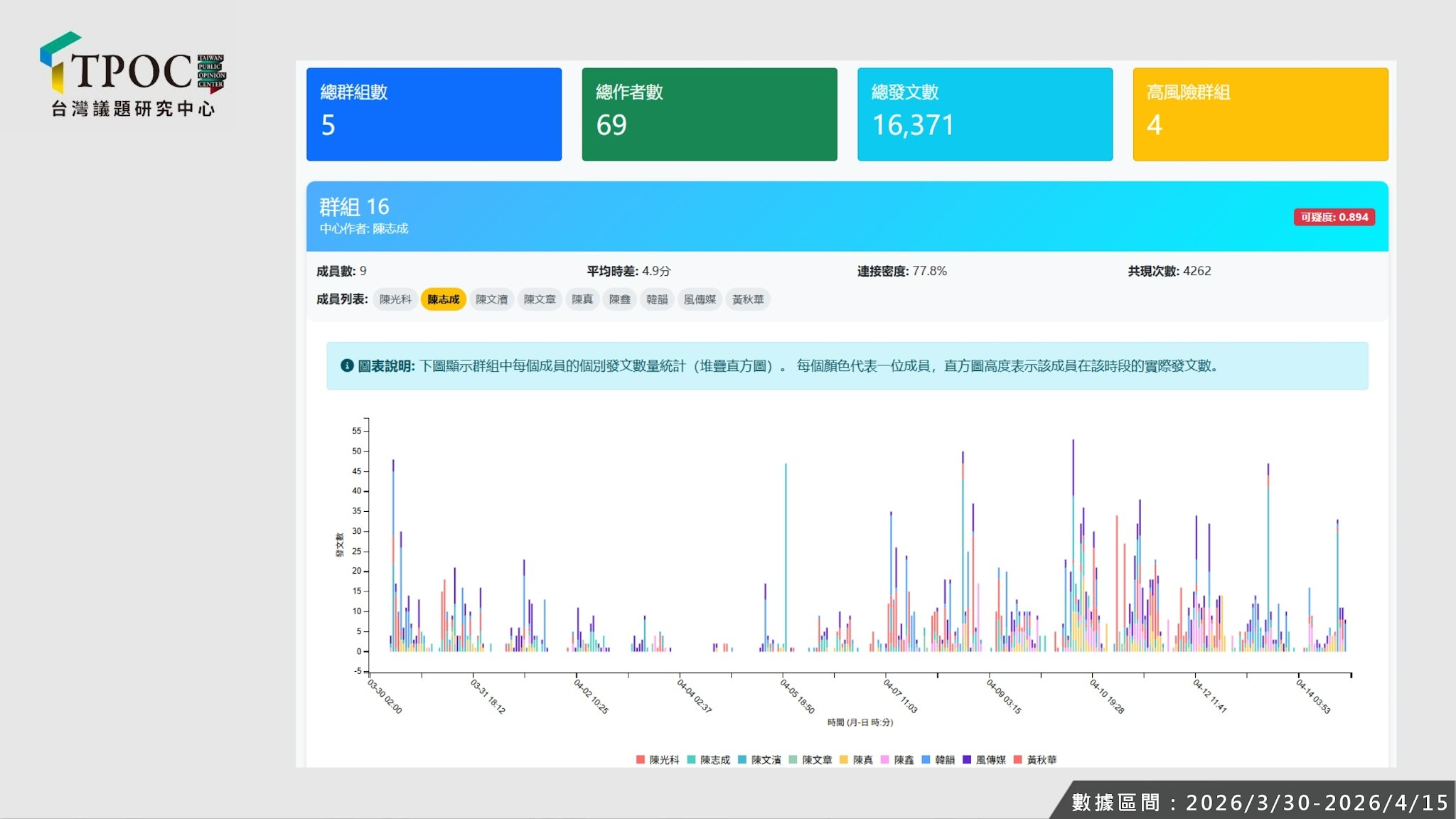 根據 TPOC 假帳號監測系統的深度分析,本次事件中被判定為「機器人網軍」的協同行為共涉及 5,879 個群組,其背後是由高達 27,535 個帳號進行重複發文操作。若以目前台灣市場上機器人帳號平台的租賃行情估算,單一帳號每月的維護費用約落在 1,000 至 3,000 元不等;這意味著,若要動員規模如此龐大的數位水軍,進而創造出本次佔比達 13.62% 的人工輿情聲量,幕後所投入的資源成本極為驚人,保守估計每月的基本開銷至少需新台幣 2,753 萬 5,000 元以上。