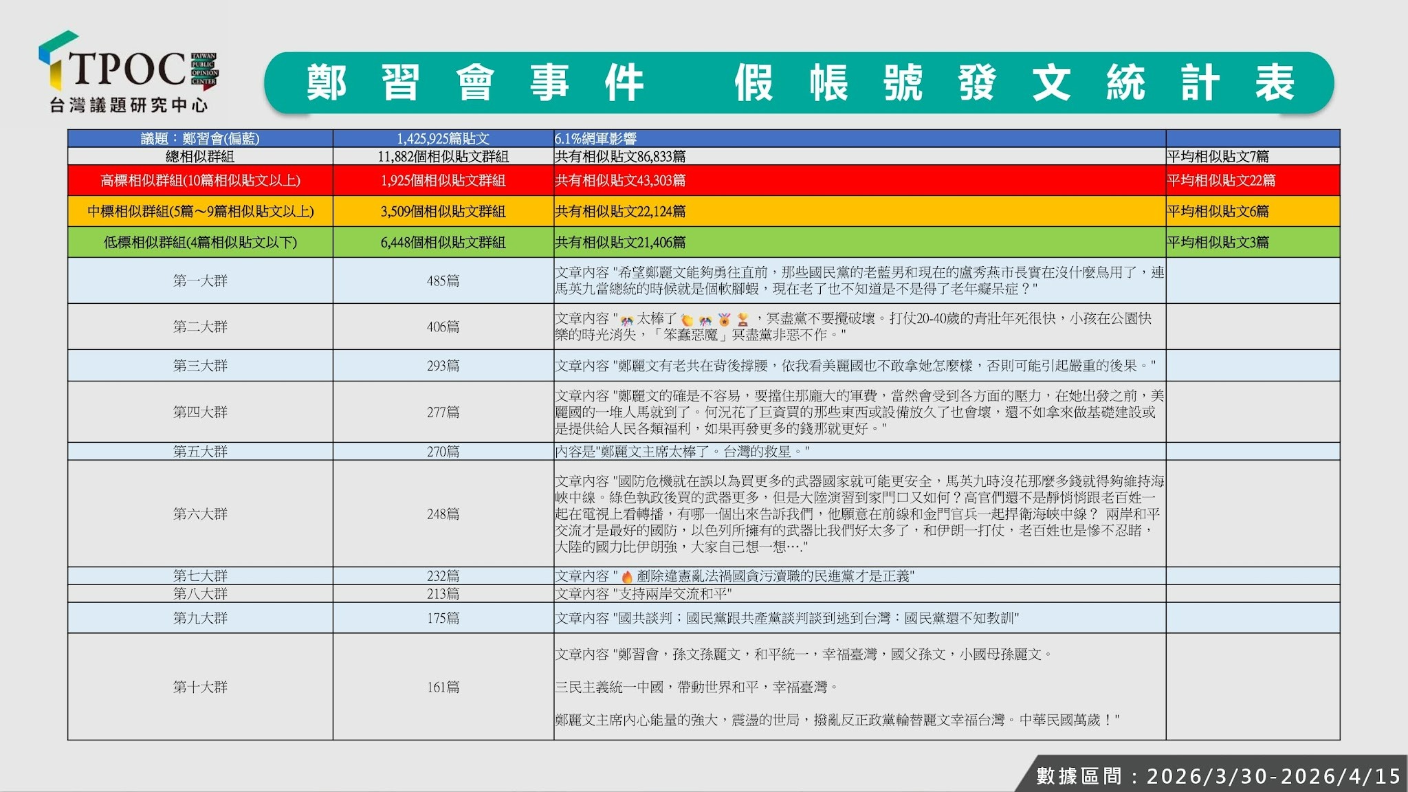 「鄭習會」引爆全台輿論沸騰!4月最強話題逾172萬,其中13.62%為「數位水軍」動員