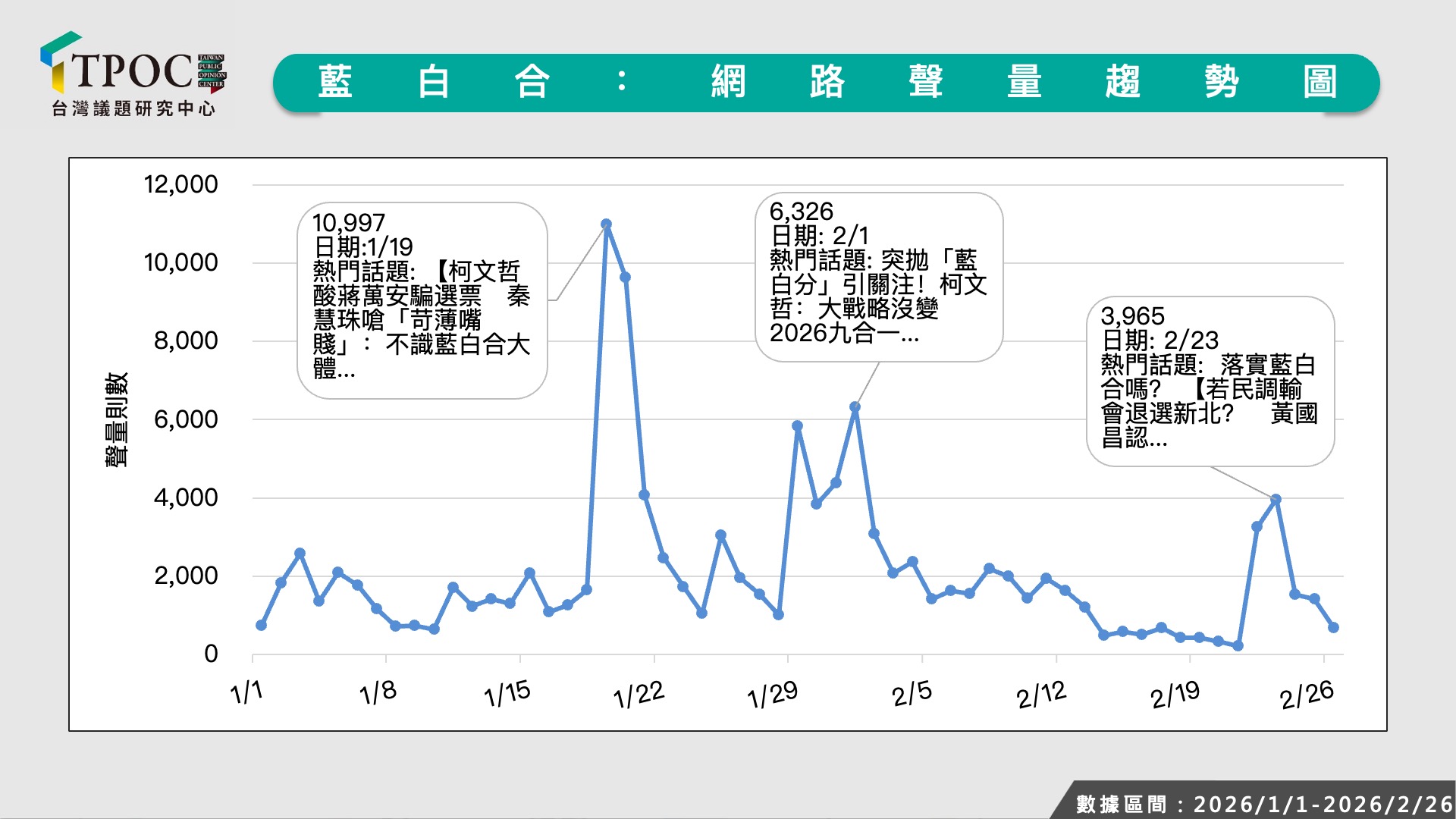 TPOC台灣議題研究中心透過QuickseeK快析輿情資料庫,調查今年1月1日至2月26日網路輿情對「藍白合」話題的討論情形。總體而言,調查期間內每日平均聲量約落在2100則左右,不過,在1月中旬前每日討論聲量並不高,每日聲量僅在1400則左右徘徊,直到前台北市長柯文哲公開批評台北市長蔣萬安「營養午餐免費政策」是民粹政治,掀起多方論戰,例如國民黨台北市議員秦慧珠就批評柯文哲「站在藍白合的角度不識大體」,吸引輿論關注,也讓藍白合討論度竄升至單日1萬餘則高峰。