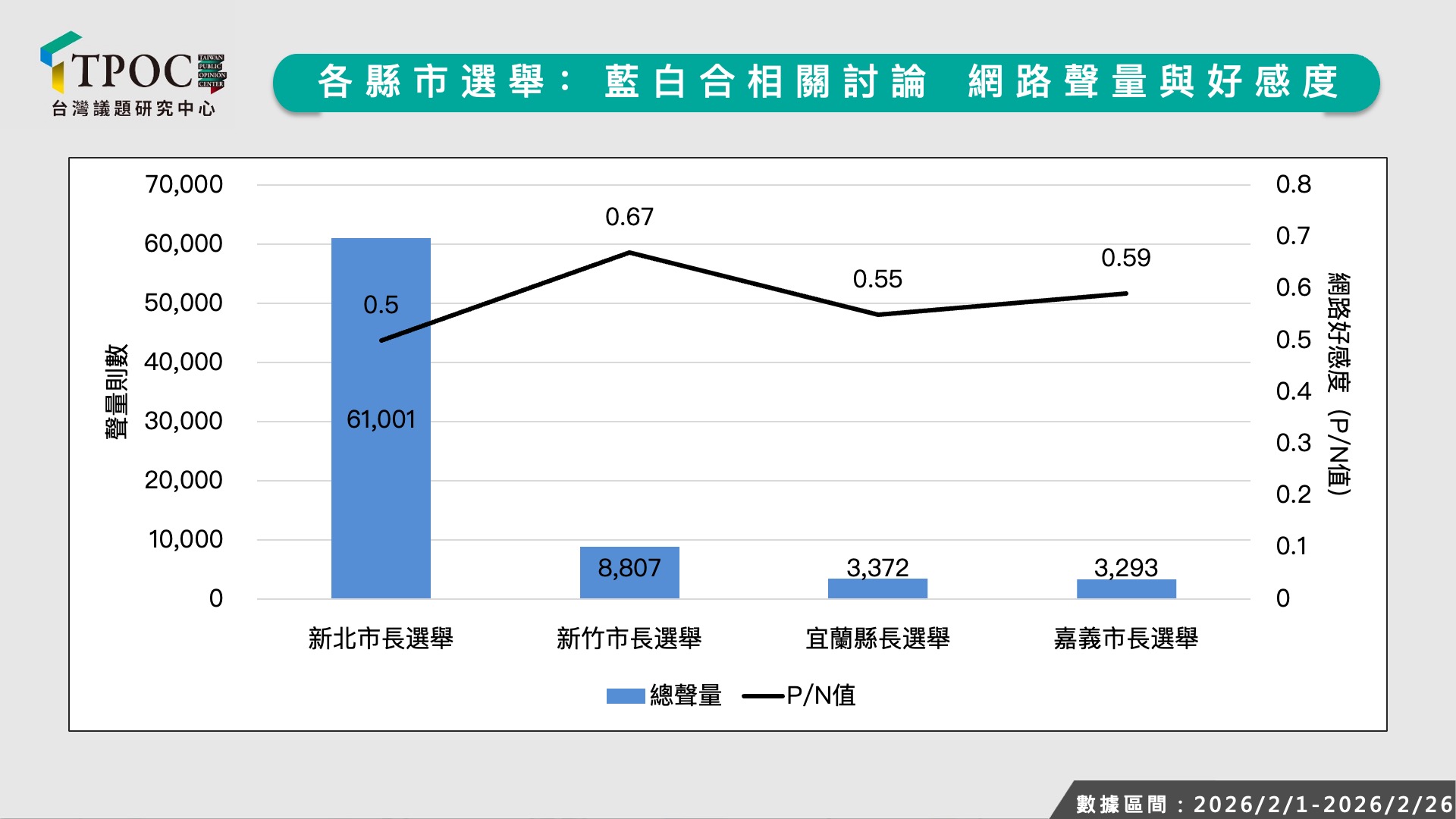 民眾黨作為國會內的關鍵少數,目前擁有8個立委席次,而在地方除了先前退黨的高虹安外,還有台北市4席、新竹市2席、彰化縣2席,以及新北市、新竹縣、台中市、南投縣、雲林縣、花蓮縣、台東縣各1席議員席次。2026年地方選舉被視為檢驗民眾黨勢力版圖消長的關鍵一役,選舉結果是擴張、維持或縮減現有席次,將牽動2028年全國大選政黨競合狀態。不過單從網路數據分析結果觀察,原本可以用來炒熱選情的「藍白合」議題現在不溫不火,未來白營是否能透過縣市長選舉佈局和縱連橫,換取更實質的議員生存空間,恐怕仍然充滿變數,也是攸關小黨生存的嚴峻挑戰。