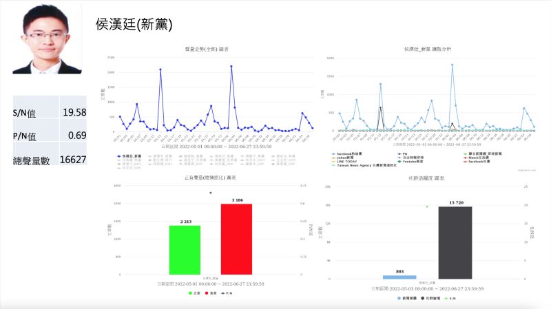 根據QuickseeK快析輿情資料庫統計數據顯示,從5月1日至6月底共計兩個月期間,士林北投區議員參選人中,網路聲量最高的是新黨現任議員侯漢廷,領先第二名的「學姊」黃瀞瑩的幅度接近兩倍。且深入分析,侯漢廷的網路聲量多數來自於臉書,也因為侯漢廷長時間經營粉絲專頁,不僅分享市政相關議題,也會針對國內政治以及國際關係進行分析,因此已經培養出自己的閱聽眾,且也不限於士林北投區,因此網路聲量才得以拔得頭籌。