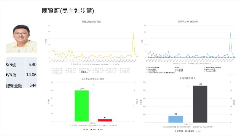 至於後段班部分,則有7人的網路聲量相對來說較為落後,其中包含林世宗、陳慈慧、林瑞圖、陳政忠、楊靜宇在內5人為現任議員,5人都是較為深耕地方基層,並不積極於經營網路聲量的傳統議員,且都有各自的基本版圖,因此影響有限;不過對於2名新人陳賢蔚與林杏兒來說,則有些許警訊。