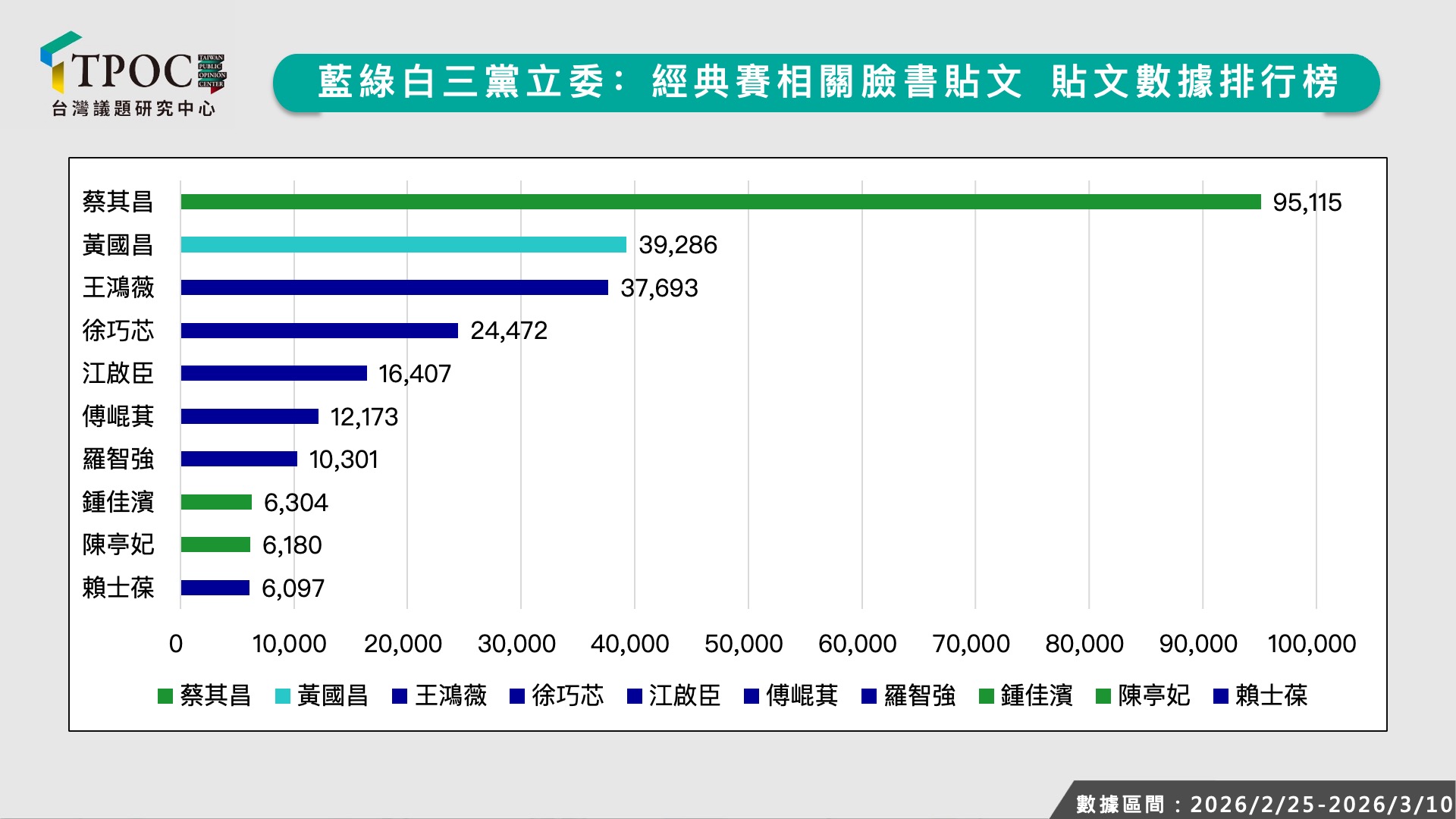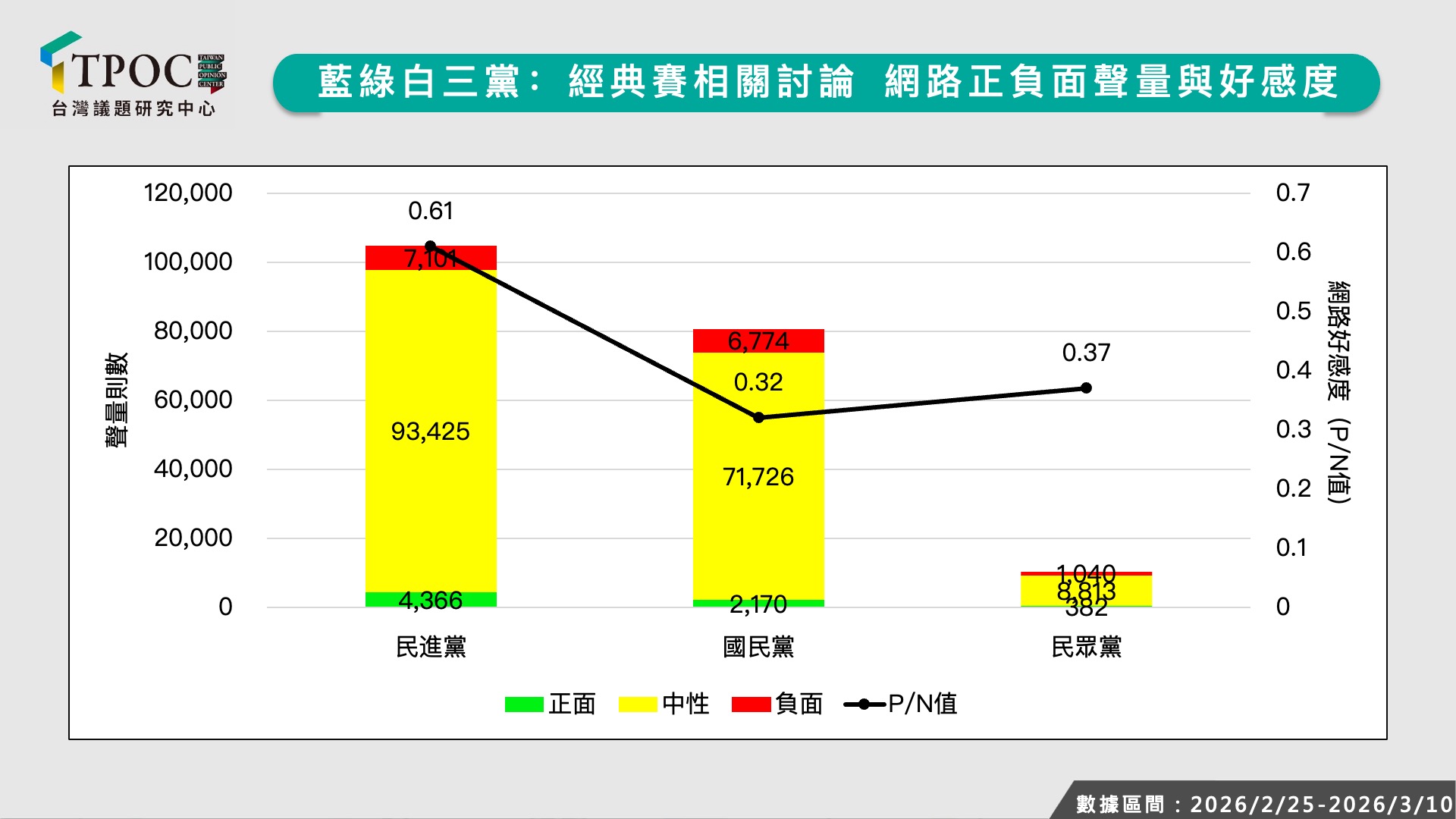 TPOC台灣議題研究中心透過QuickseeK快析輿情資料庫,蒐集國民黨、民進黨、民眾黨在WBC預賽前後的網路聲量,結果發現,民進黨無論在總聲量及好感度均呈現壓倒性的領先,總聲量超過10萬則、好感度達0.61,儘管行政院長卓榮泰包機赴日看球、為選手加油打氣,被在野黨輪番質疑「誰買單」,後續掀起不小波瀾,但仍不影響其他正面聲量,如總統賴清德援引動漫台詞「努力過的人都是戰士」、中華職棒會長蔡其昌徵召旅外選手的背後故事等,都吸引網友留言讚聲。國民黨方面,多名藍委在賽後猛轟卓榮泰赴日包機案,挨轟是「把棒球外交當弊案」、「是不是見不得台灣好」,反而累積不少負面聲量,好感度只有0.32敬陪末座,總聲量約8萬則。民眾黨總聲量較低僅1萬則左右,好感度為0.37。