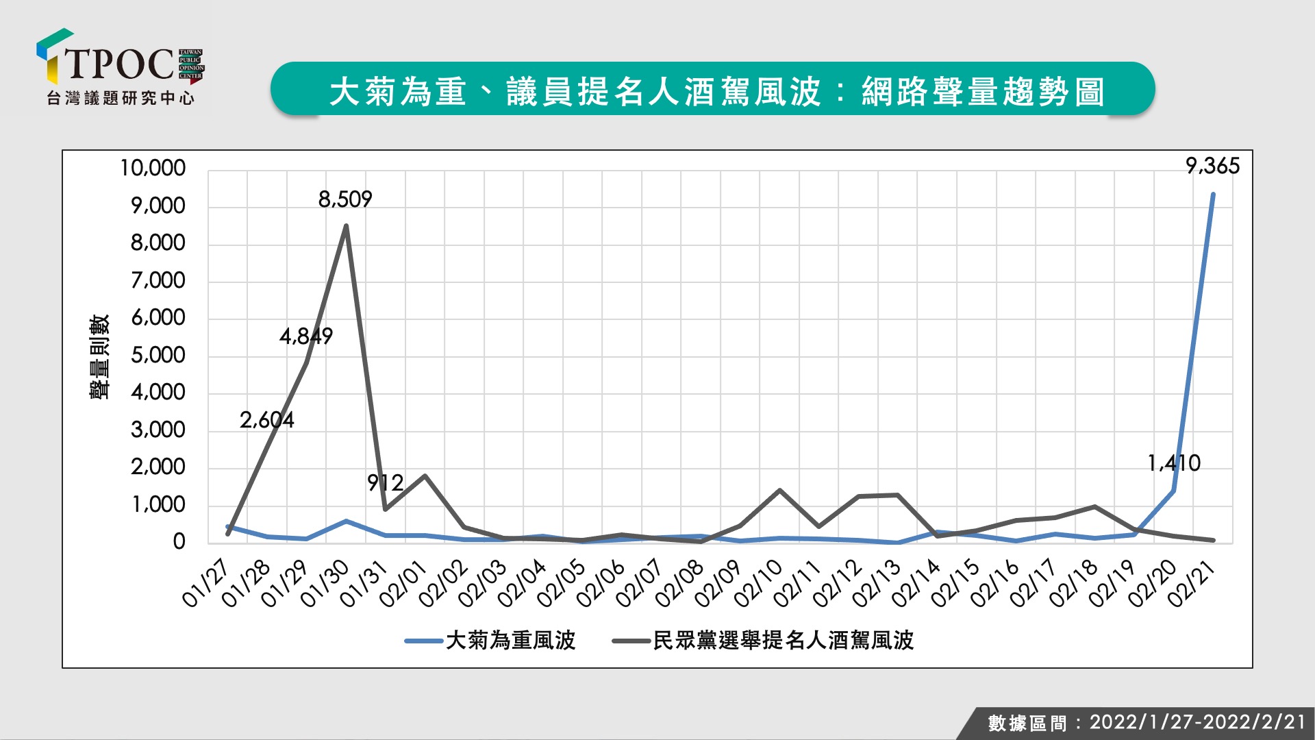 TPOC台灣議題研究中心透過QuickseeK快析輿情資料庫,分析近1個月來民眾黨議員被提名人爆酒駕、大菊為重兩大風波的網路聲量走勢,結果發現,今年1月底民眾黨新北、桃園市議員提名人林致兵、陳品杰遭起底有酒駕不良記錄後,網路聲量連燒三天,聲量高峰在1月30日,單日聲量飆到逾8千,引發高度關注;另一方面,2月底黃瀞瑩、楊寶楨以「大菊為重」暗諷陳菊惹議時,網路聲量則是未經醞釀瞬間爆發,昨(21)日單日聲量來到9.3千則。民眾黨在短短1個月內出現兩波爭議事件,均以負面聲量居多,可能已在選民心中留下負面印象。