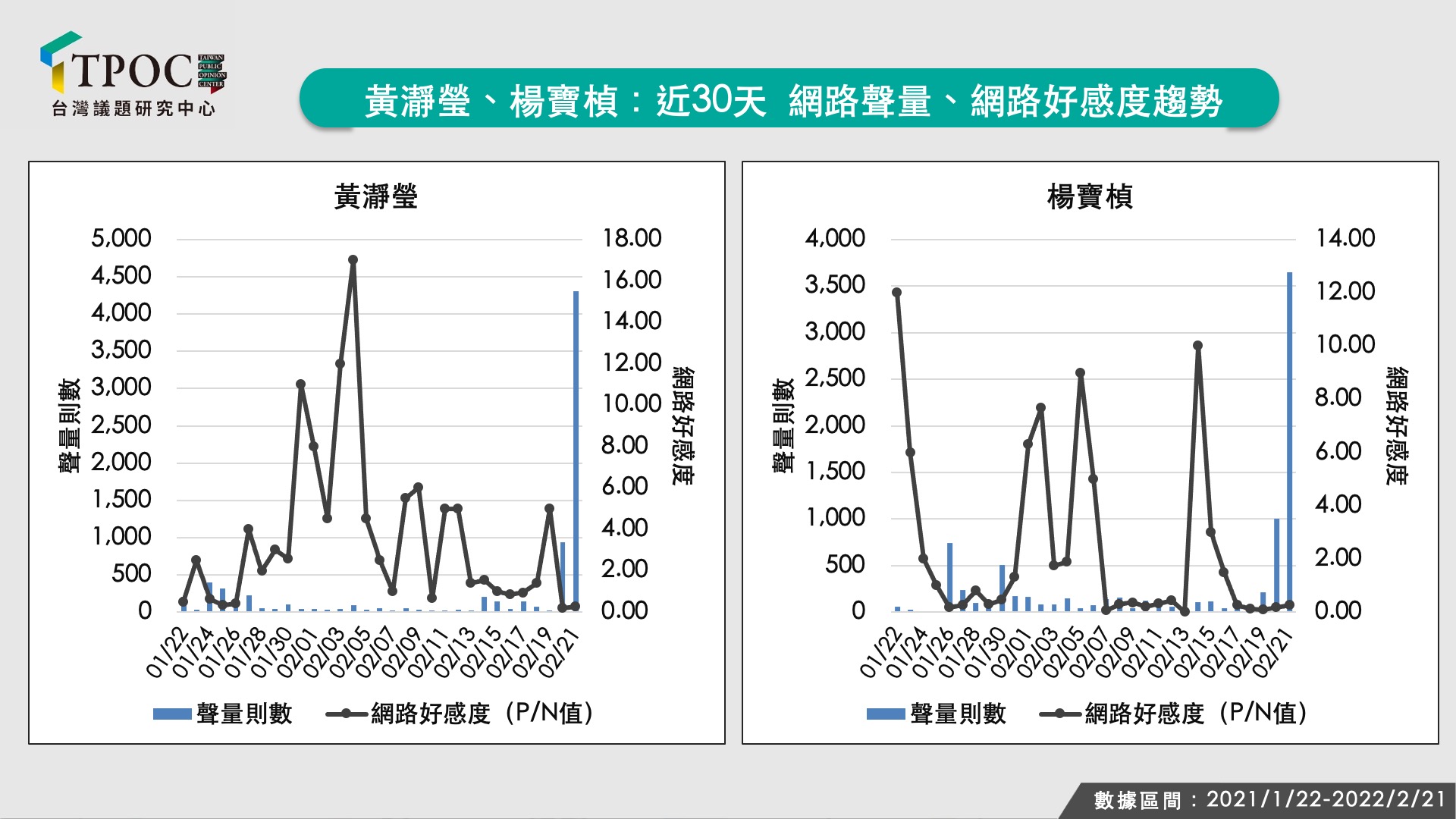 總體而言,兩人近一個月的網路聲量表現雖稱不上亮眼,但因兩人皆用心經營個人臉書頻道,偶能創造話題吸引粉絲迴響,聲量多是正面大於負面,例如黃瀞瑩單月有22天正面聲量高於負面,楊寶楨則有14天,但此次爭議事件發生後,兩人吸引同溫層粉絲以外的網友批評,導致好感度(P/N值)雙雙探底,P/N值皆跌落至0.25左右,意即每5則聲量中僅剩下1則正面聲量,實屬得不償失。