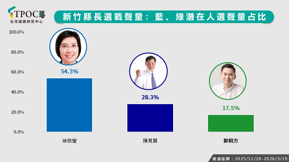 TPOC台灣議題研究中心針對三位潛在候選人近一季網路輿情進行分析。根據統計結果,三位候選人中,國民黨的徐欣瑩以54.3%過半的聲量占比領先其他2位候選人,其次為國民黨的陳見賢(28.3%)、以及民進黨的鄭朝方(17.5%)。