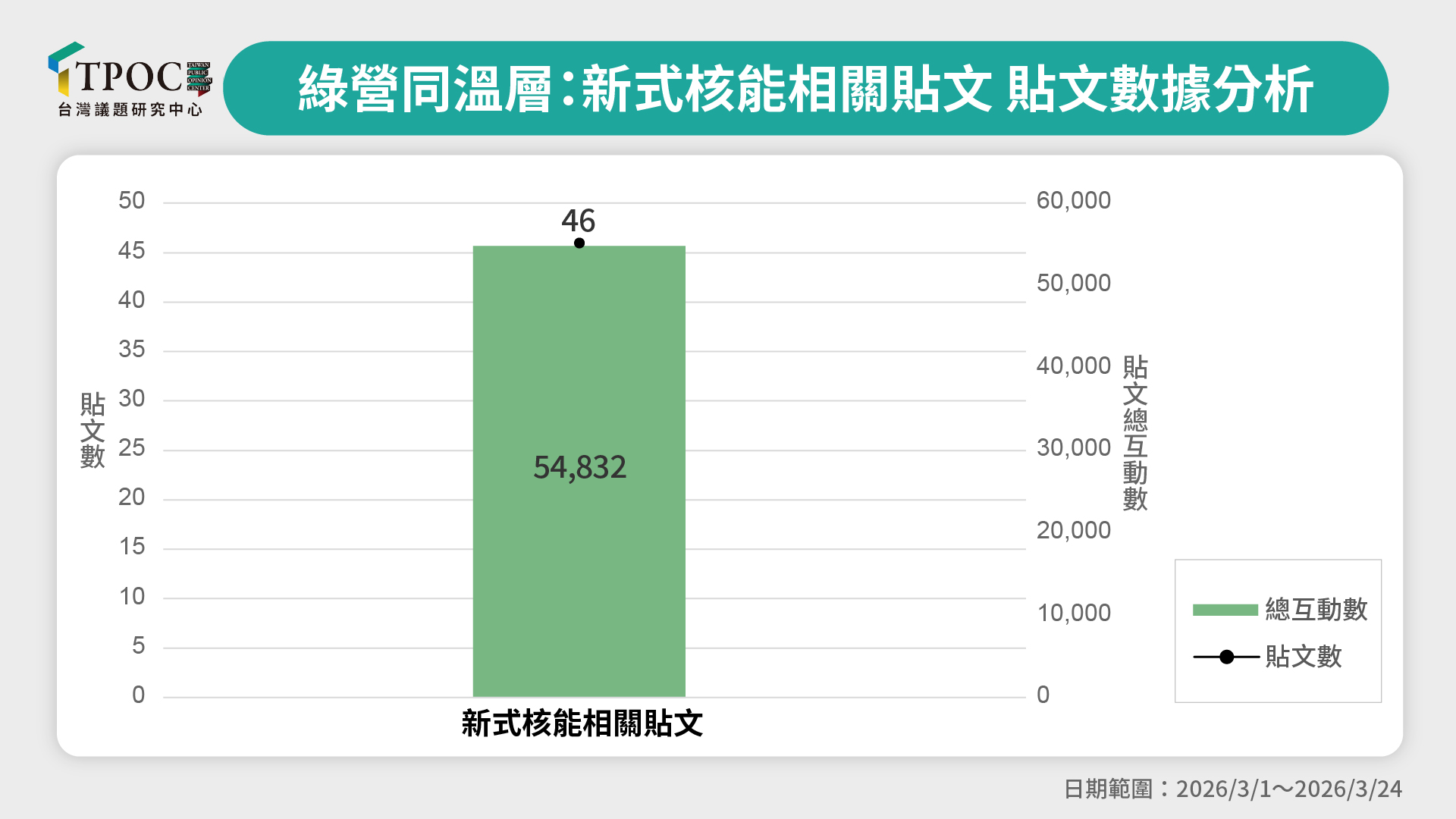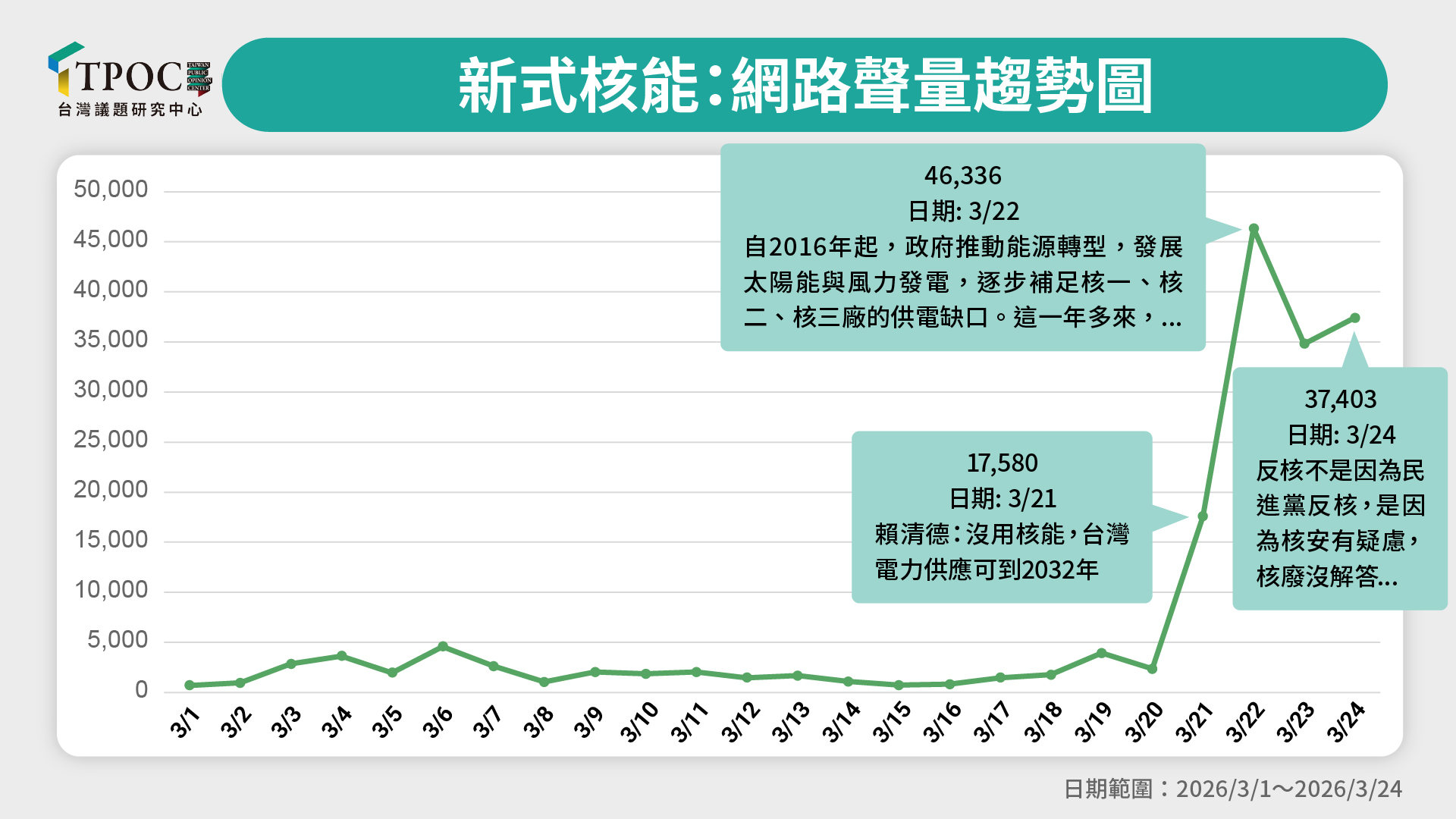 TPOC台灣議題研究中心透過QuickseeK快析輿情資料庫,調查今年3月1日至3月24日之間,網路輿情對於「核能」議題的看法。調查期間內,整體聲量熱度持續增加,首個高峰出現在3月21日賴清德公開談論核電重啟議題後,有府方人士向媒體強調,「即使不重啟核電,台灣到2032年供電都沒有問題」,否認在野黨質疑「缺電」的說法,單日聲量超過1.7萬則;3月22日賴清德親上火線接受媒體聯訪,強調討論核電要基於「 核安無虞、核廢有解、社會有共識」等3個前提,單日聲量飆高至4.6萬則,且之後兩天討論度依然相當高,單日達到3.7萬餘則,例如擁有網路高聲量的台北市議員苗博雅發文稱,既有老舊核電機組並不具備延役條件,不過若未來科技條件成熟,「新式核能」仍可納入政策選項,同樣引發高度關注,也進一步帶動相關討論。整體而言,在賴清德拋出「返核」風向球後,網路熱度仍在延續,不過這議題的反作用力並沒有像想像中那麼大,最高單日聲量只達到4.6萬則左右,並沒有超過5萬則。