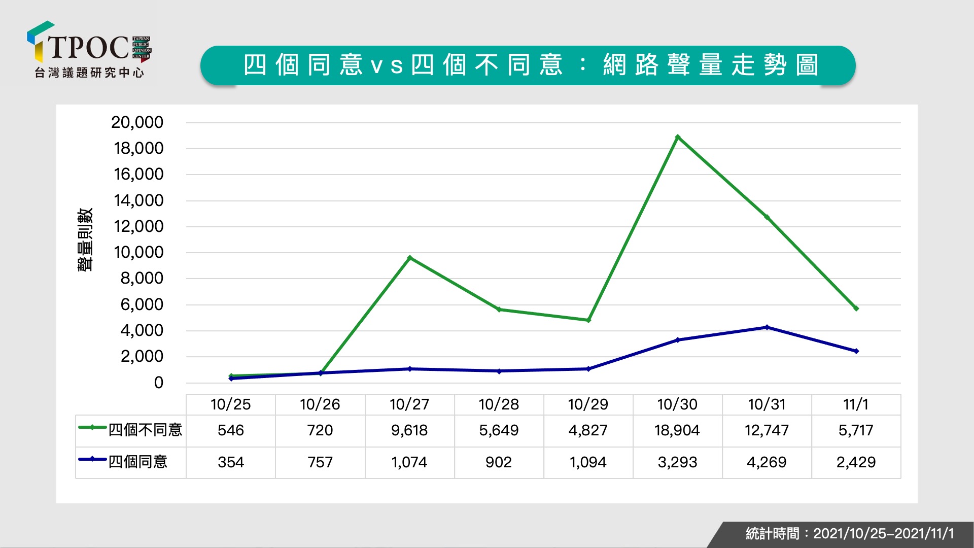 TPOC台灣議題研究中心透過QuickseeK快析輿情資料庫,分析「四個不同意」與「四個同意」的網路聲量,結果顯示,自蔡英文27日在民進黨中執會向黨公職下達軍令,重申「四個不同意」後,其聲量走勢大幅攀升,單日聲量近1萬則,超越原本持平的「四個同意」聲量。而在30日民進黨舉行首場公投說明會後,截至本月1日止,雙方聲量差距擴大至76%。顯示雖然國民黨發動夜宿凱道、公投萬聖趴等,卻並未帶動「四個同意」相關討論,反而民進黨的宣傳策略較能引發網友關注。