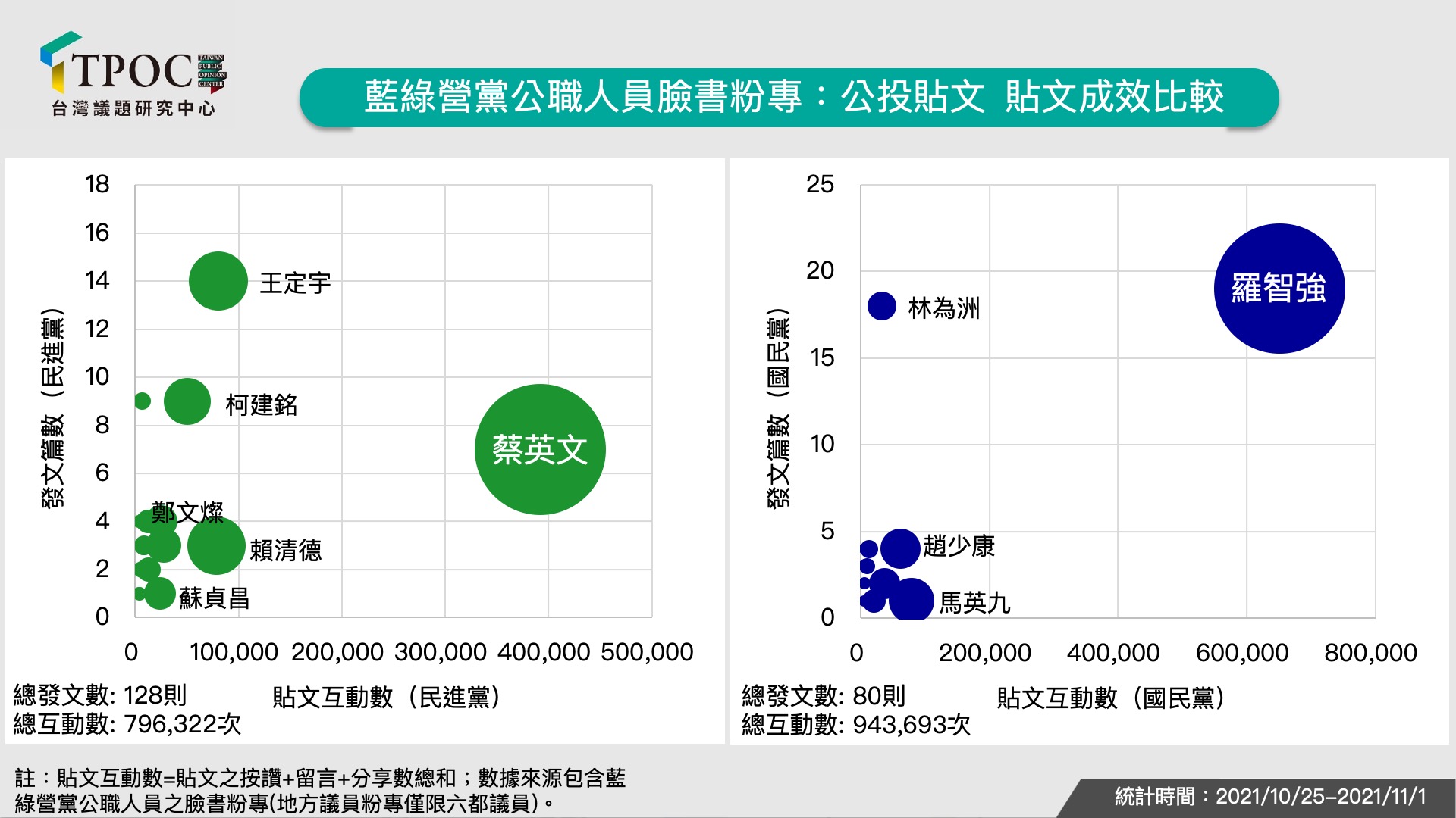 從公投相關貼文的成效分析,發現國民黨粉絲互動全集中在台北市議員羅智強身上,佔藍營粉絲整體互動數的7成,綠營扣掉聲量最高的蔡英文還有逾40萬互動數,反觀藍營僅剩29萬,落於下風。顯示「四個不同意」聲量上升,得利於綠營「遍地開花」與選民溝通,而國民黨全黨宣傳力道似乎已出現疲態,可謂只剩羅智強1人苦撐。