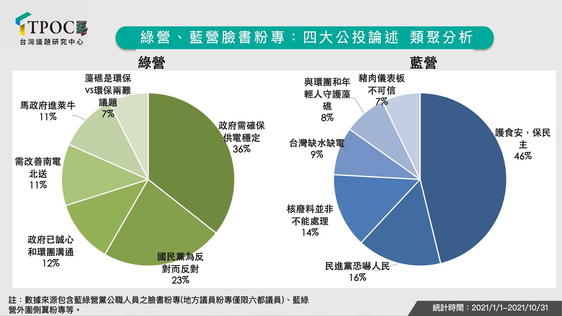 綜觀一整年藍綠在公投議題的攻防內容,透過藍綠陣營論述內容的類聚分析發現,綠營面對4大公投案,多是採取正面論述,強調政府必須穩定供電、已誠心和環團溝通、必須改善南電北送,同時指出國民黨為反而反;反觀藍營則倚仗民氣可用,多採用口號式,例如高喊「護食安保民主」就佔藍營論述內容近5成的聲量,或用鬥爭式論述煽動民意,例如民進黨恐嚇人民、台灣缺水缺電等,兩者合計有2成5聲量。