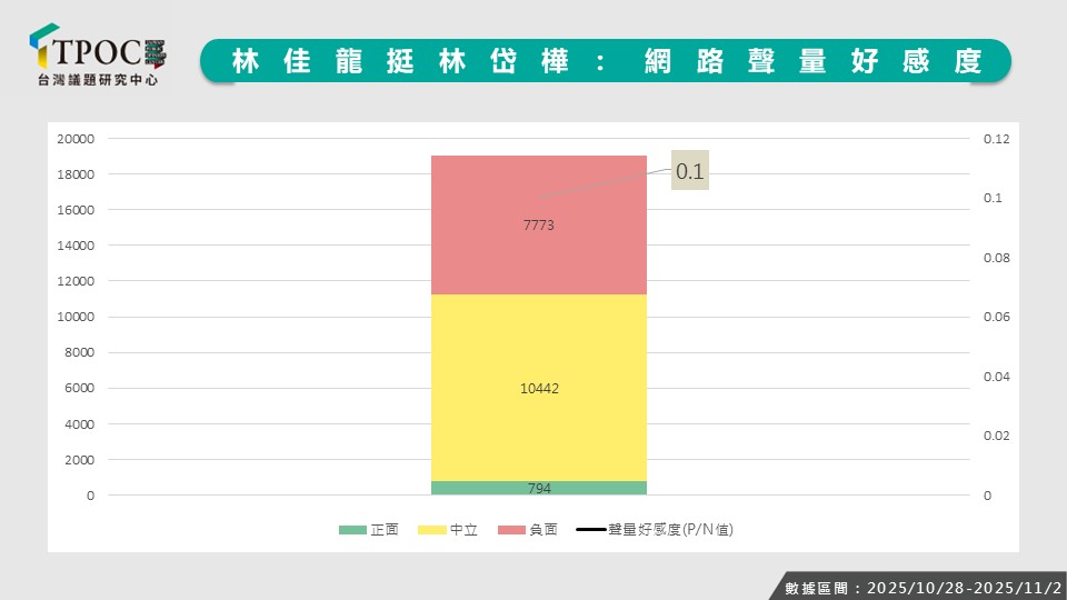 相較之下,僅794則正面聲量肯定林佳龍「有情有義」、「願意逆風相挺」,表達對其行動的認同。至於中性討論則多採觀望態度,除了提及邱議瑩、賴瑞隆等其他可能人選,也有網友以看熱鬧心態留言「網內互打」、「我要看到血流成河」,凸顯此事件已成為綠營內部矛盾的輿論焦點。